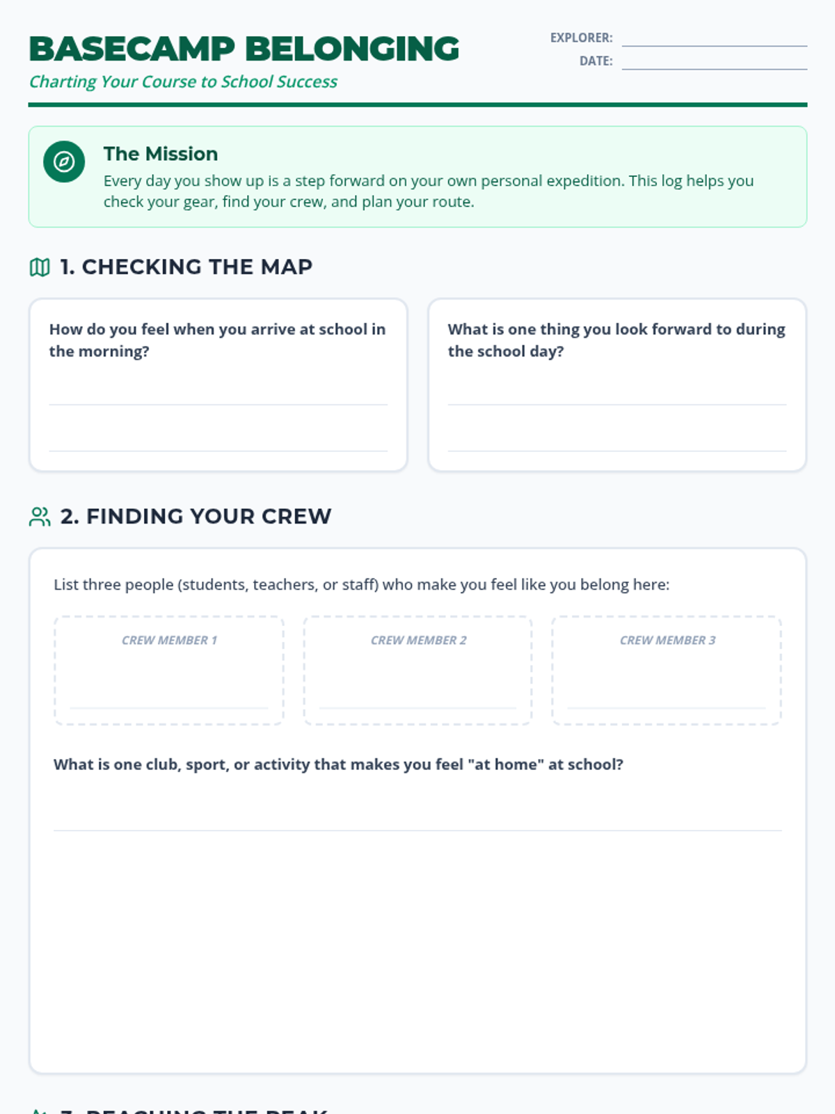 A student reflection worksheet designed for 6th graders to set attendance goals and reflect on their sense of belonging within the school community. Features an expedition-themed layout with space for goal setting and problem-solving.