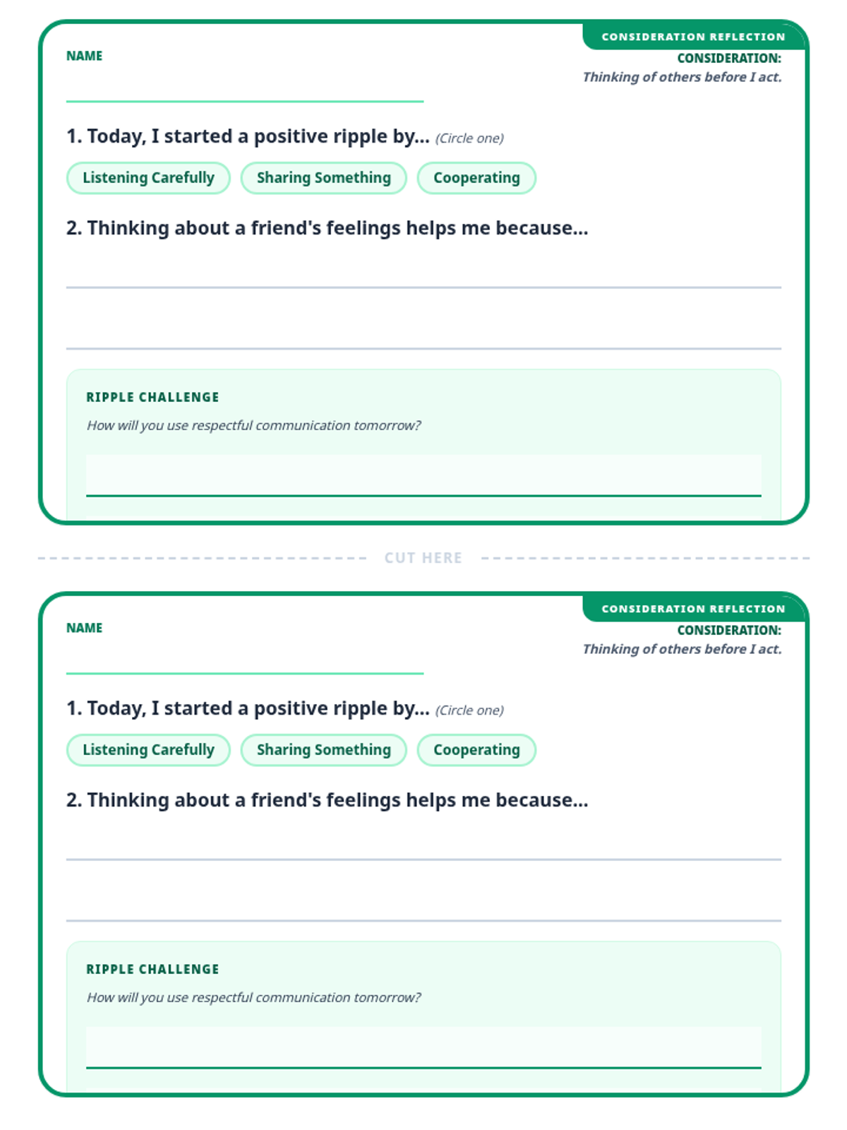 A printable student reflection slip designed with clean writing lines and selection options, focused on the ripple effect metaphor and practicing consideration. Increased definition text size and darkened writing lines for legibility.