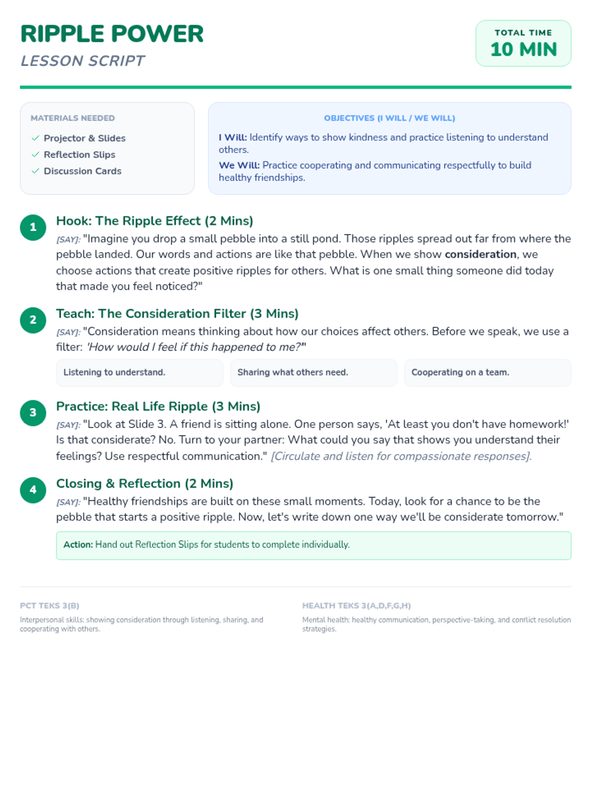 A teacher-facing script for a 10-minute whole-group lesson on consideration and the ripple effect, featuring structured timing, student objectives, and specific dialogue prompts.