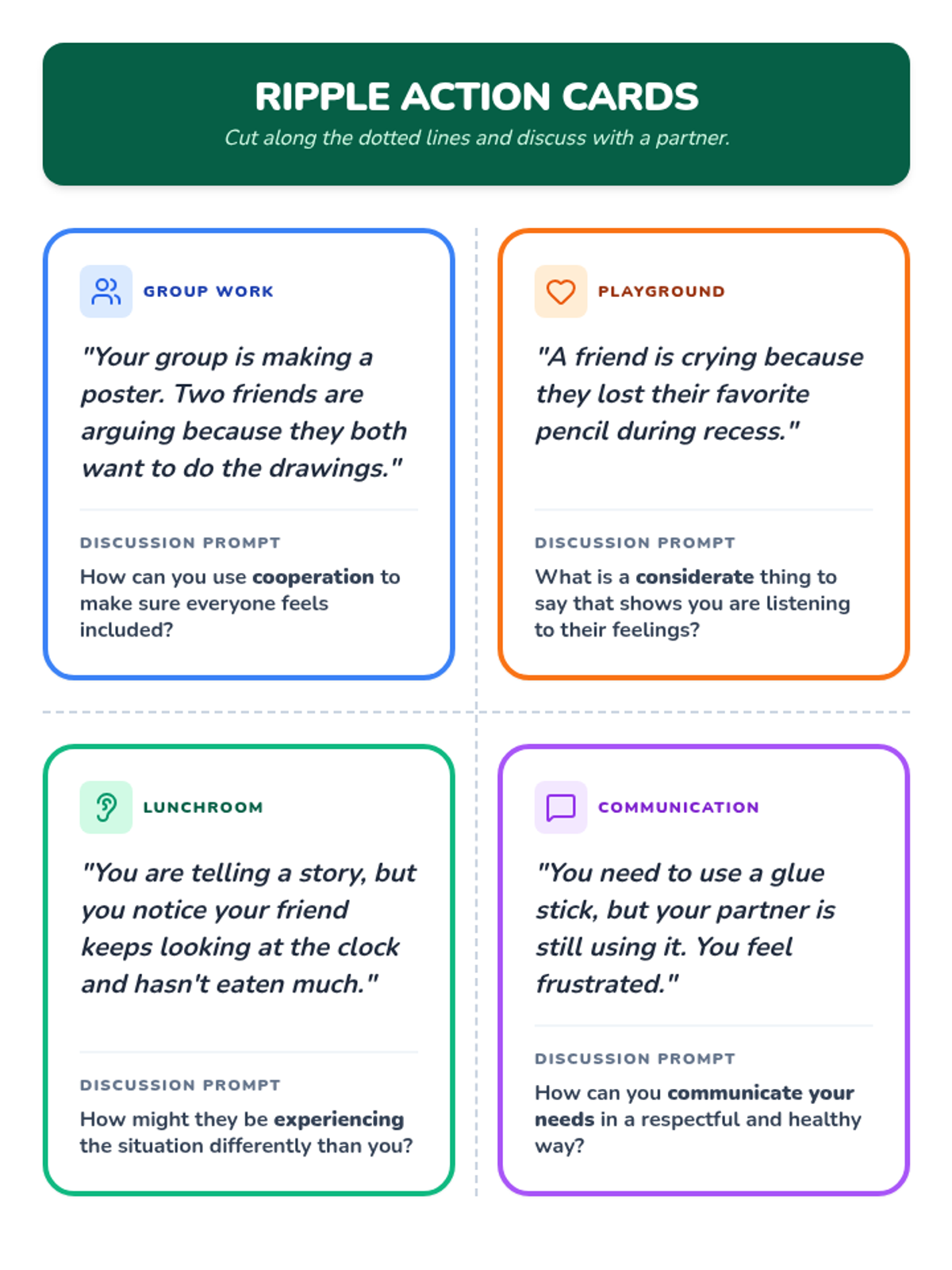 Discussion prompt cards featuring real-life scenarios. Revised with dotted cut lines, increased label contrast, and white background for ink efficiency.