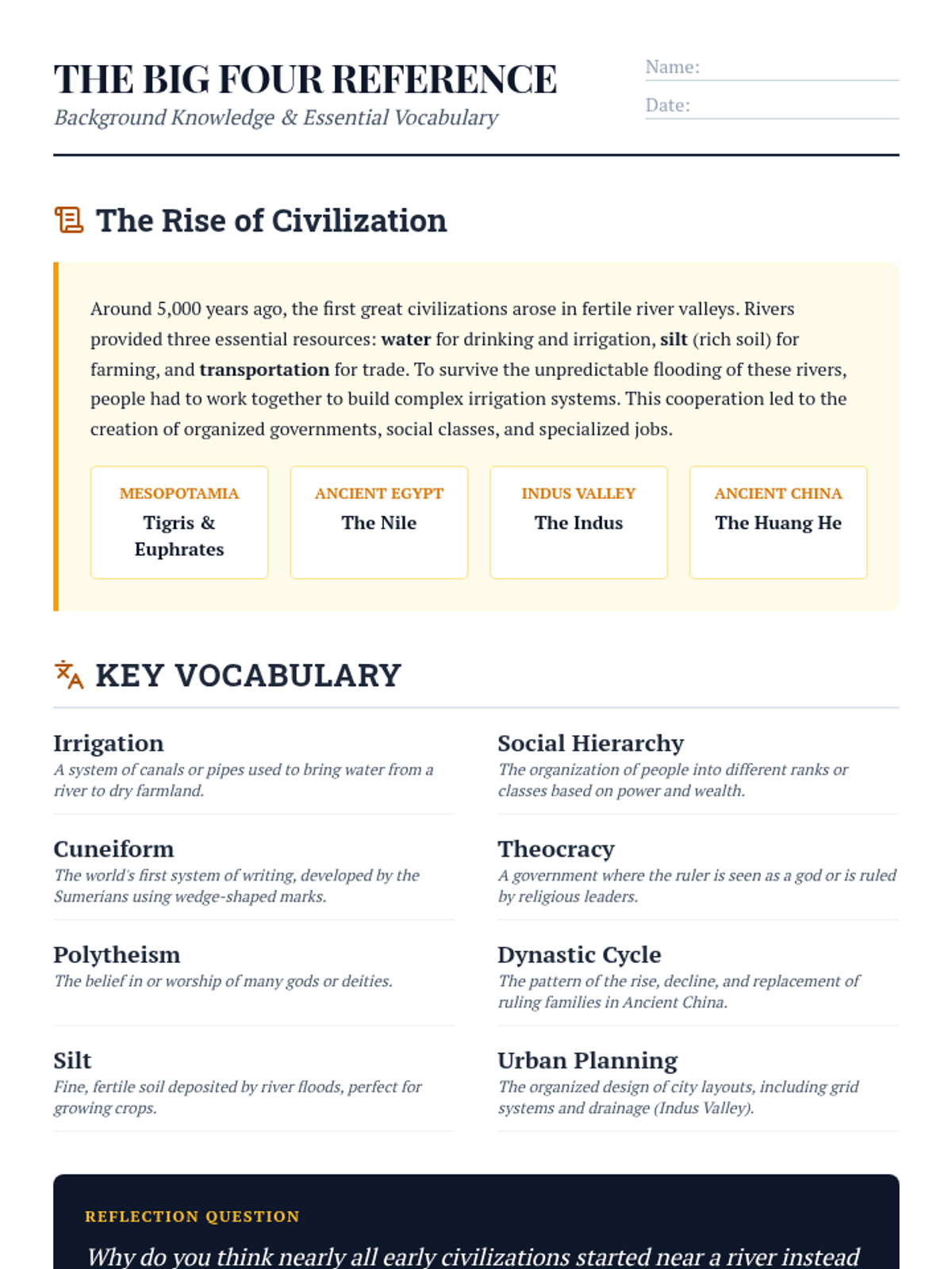 A comprehensive student reference sheet containing essential background knowledge on the rise of civilizations and a glossary of key vocabulary terms used throughout the unit.