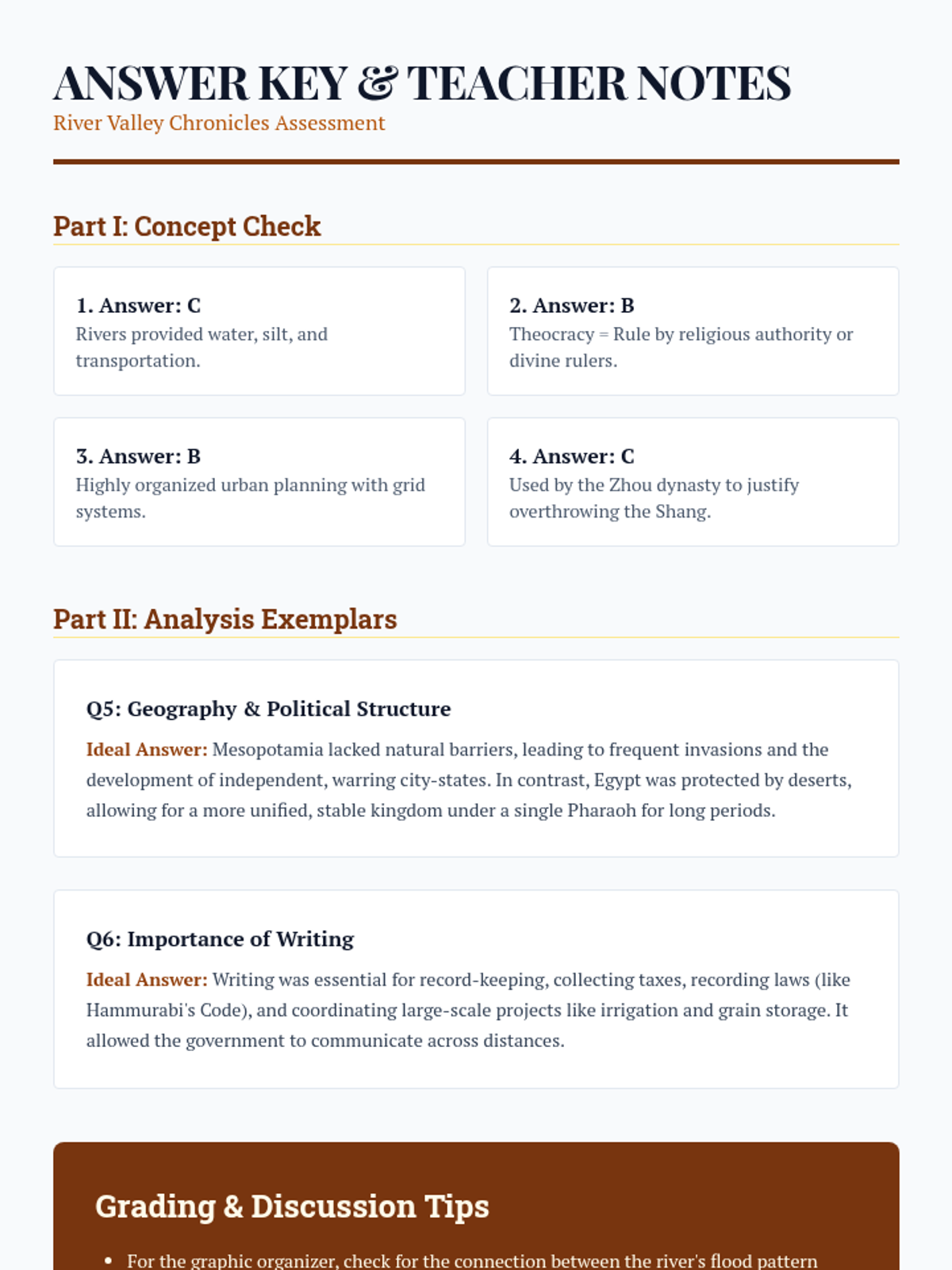 A teacher's guide and answer key for the unit assessment, including exemplar responses for short-answer questions and instructional tips for grading and facilitating discussions.