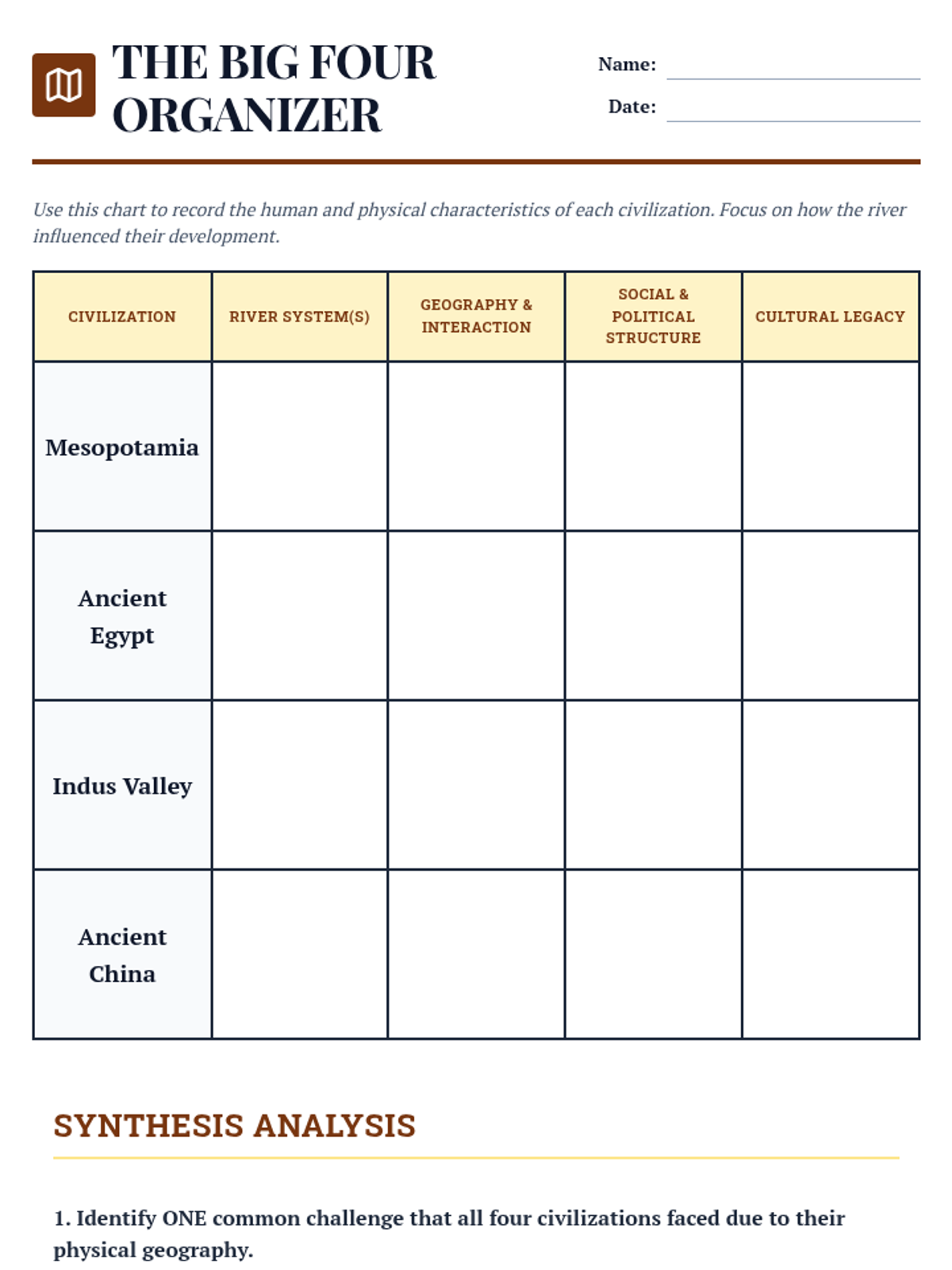 The primary graphic organizer for the unit, allowing students to compare the physical and human characteristics of Mesopotamia, Egypt, the Indus Valley, and Ancient China side-by-side.