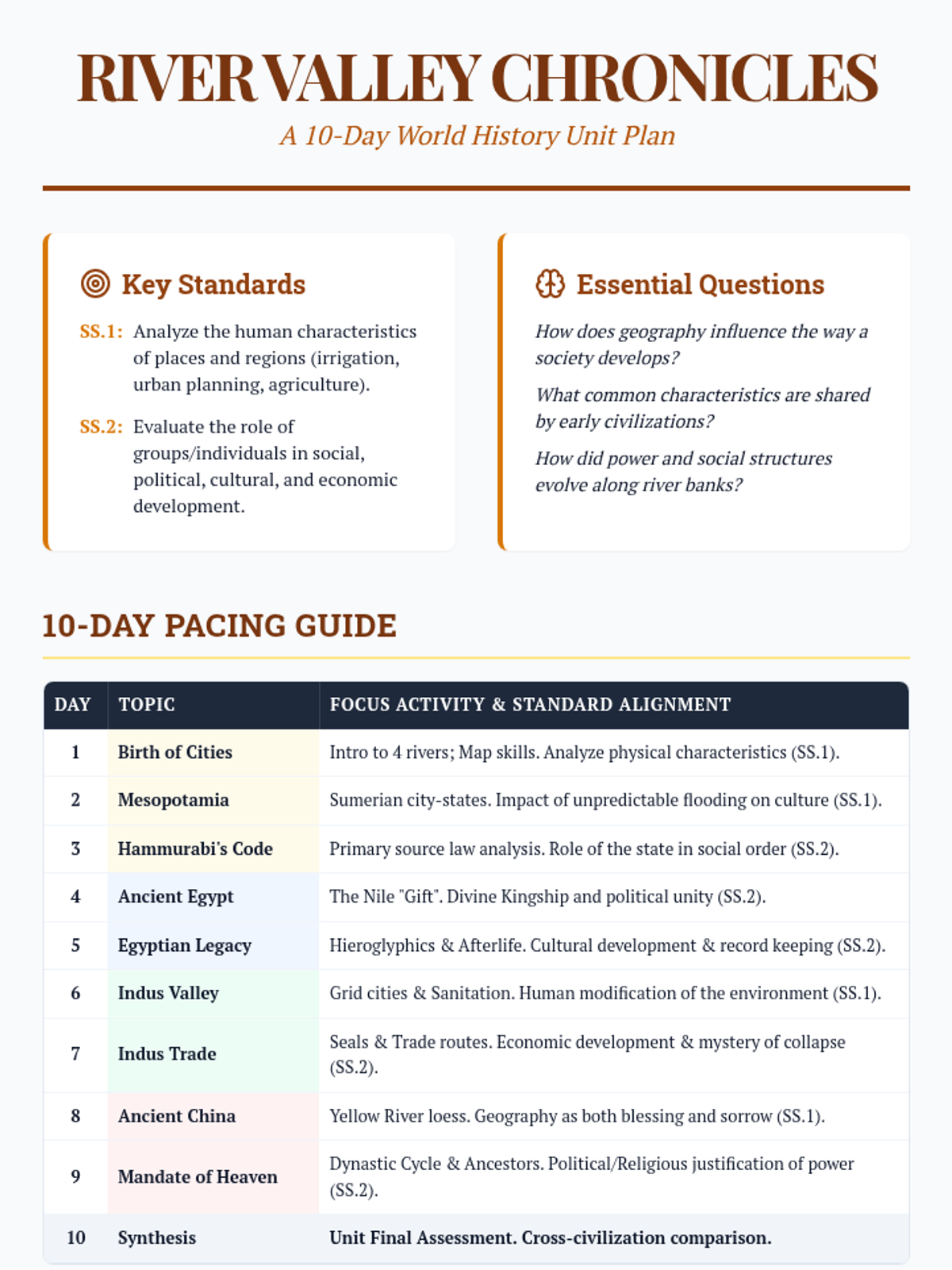 A comprehensive 10-day unit plan for teachers outlining the standards, daily pacing, and assessment strategies for the River Valley Chronicles unit.
