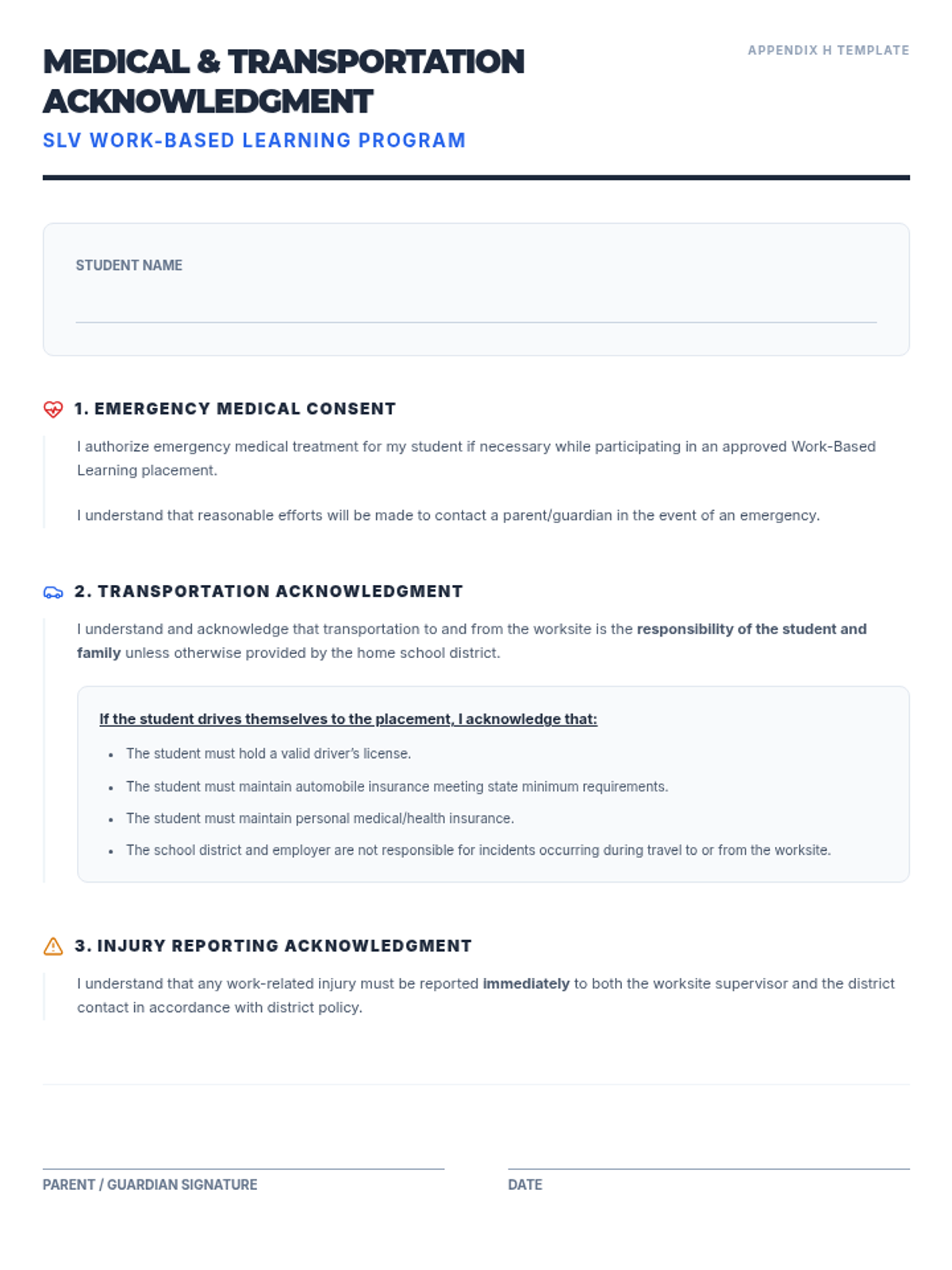 Official SLV PWR Medical & Transportation Acknowledgment form (Appendix H), detailing emergency consent, personal vehicle requirements, and injury reporting obligations.