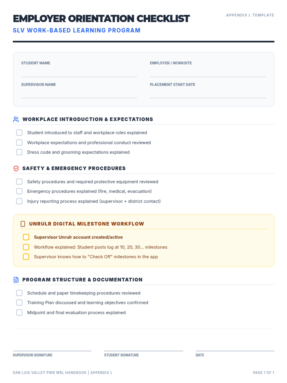 Official SLV PWR Employer Orientation Checklist (Appendix L), designed to guide the first-week onboarding process for internship hosts. Updated with Unrulr digital verification setup steps.