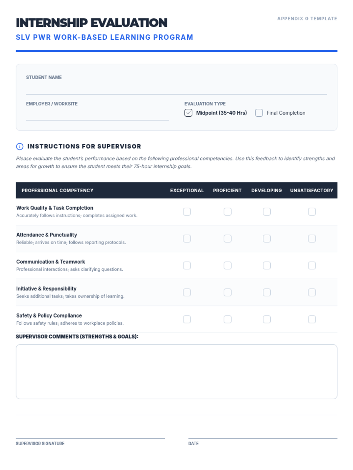 Official SLV PWR Internship Evaluation forms (Appendix G), including separate sections for midpoint feedback (35-40 hours) and final performance review.