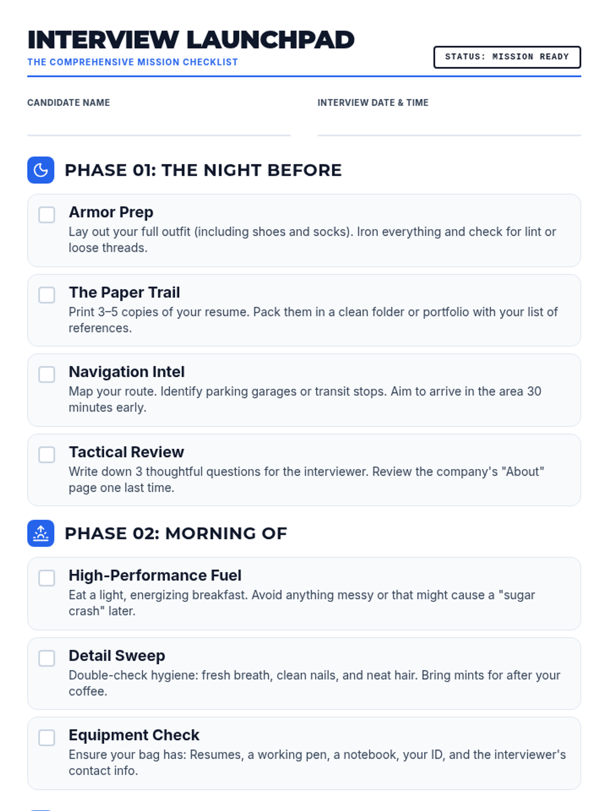 A comprehensive, step-by-step interview preparation checklist designed with a professional 'mission launch' theme. It covers the night before, morning of, and arrival stages with clear checkboxes and visual hierarchy across two logically structured pages.