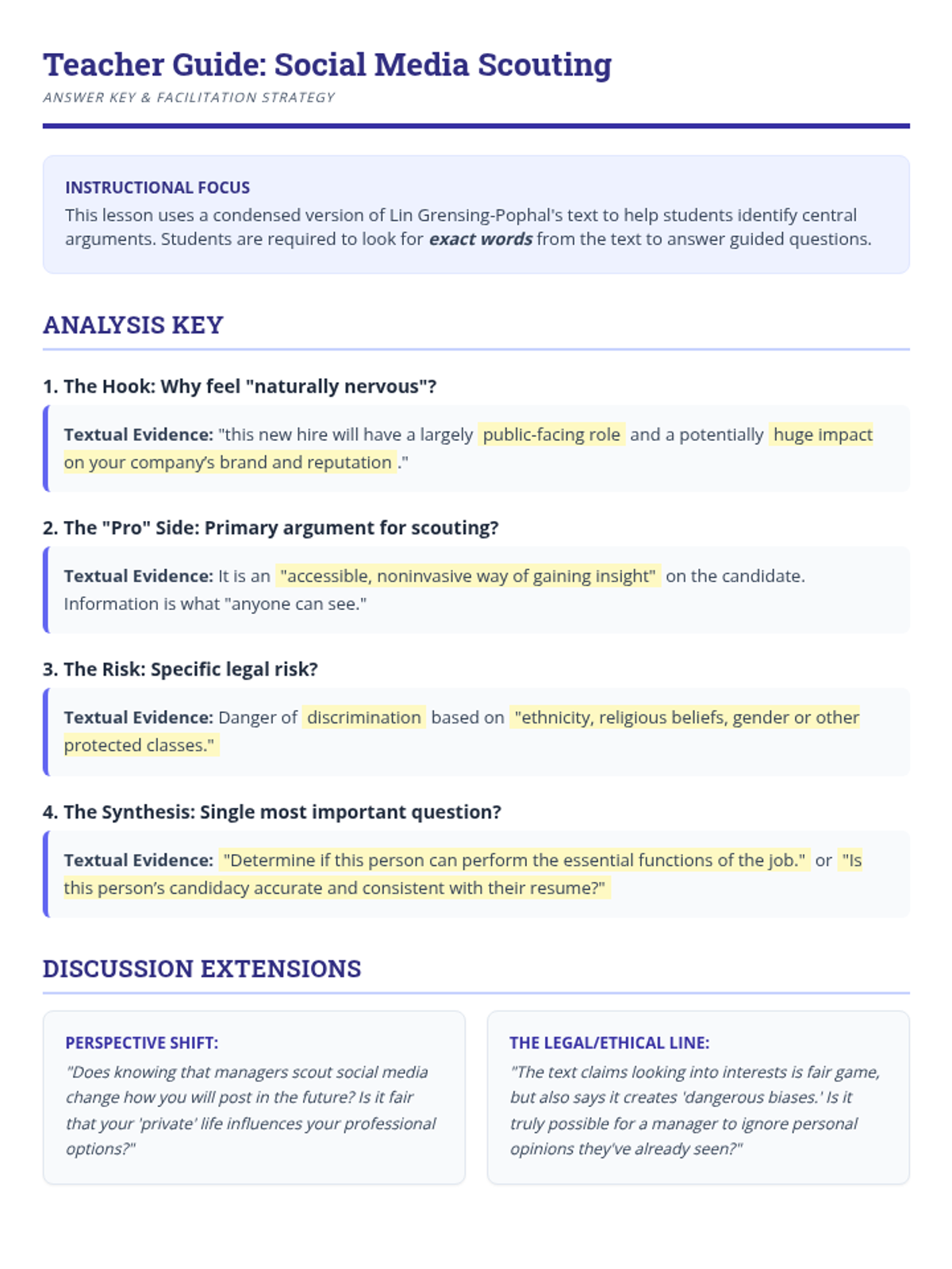 An abbreviated reading passage using the author's original words, followed by guided comprehension questions to help students identify and analyze the central argument regarding social media in hiring.