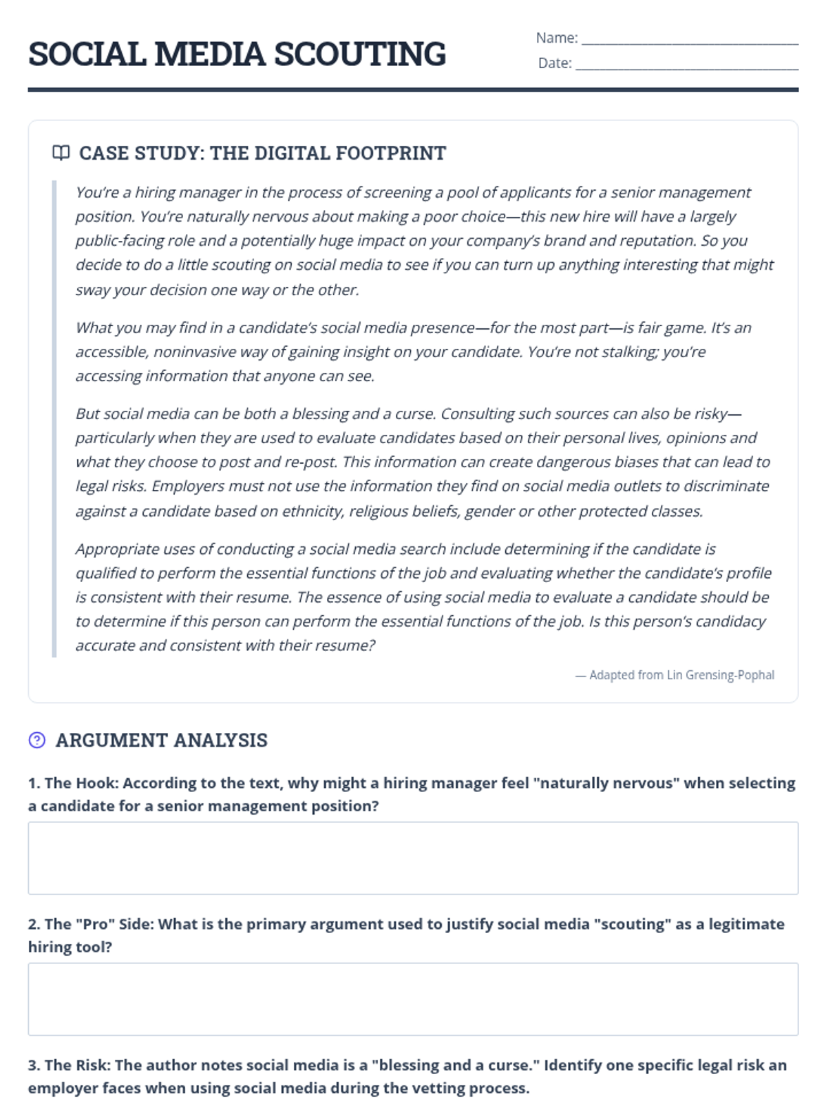 A structured worksheet featuring a narrative case study and guiding questions designed to help students analyze the ethics of social media screening and build a evidence-based argument.