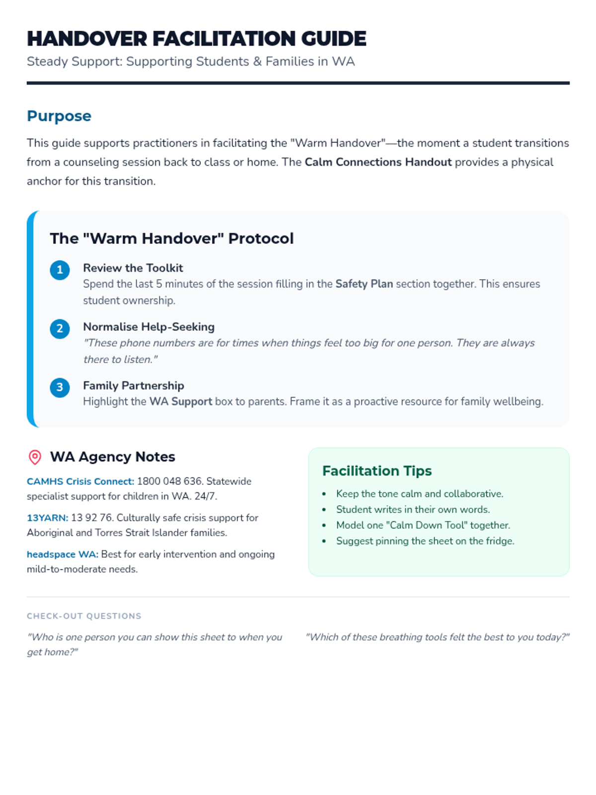 A teacher-facing guide for effectively facilitating the handover of the Calm Connections handout to primary students and their families, featuring Western Australia-specific referral advice.