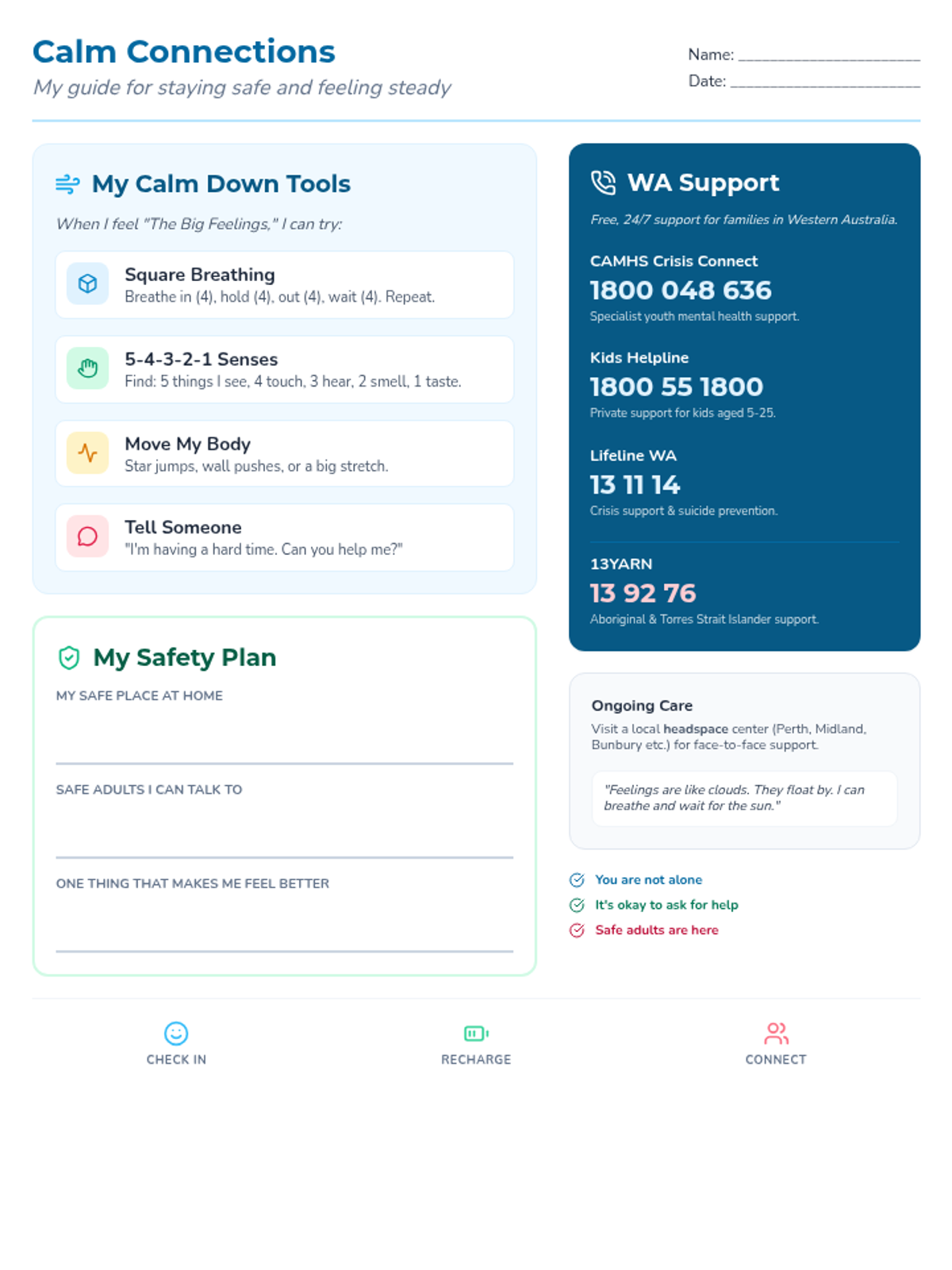 A one-page student and family handout providing emotional regulation strategies, a basic home safety plan, and key Western Australia-specific crisis support contact numbers for primary-aged children.