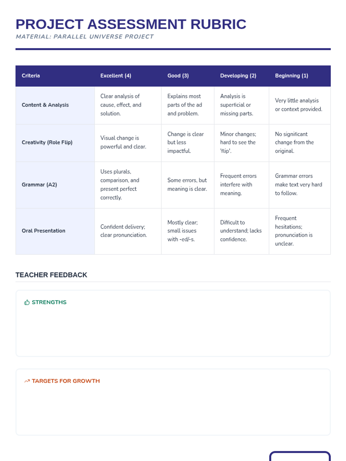A teacher-facing assessment rubric for the Parallel Universe project, covering analysis, creativity, grammar usage, and oral presentation skills.