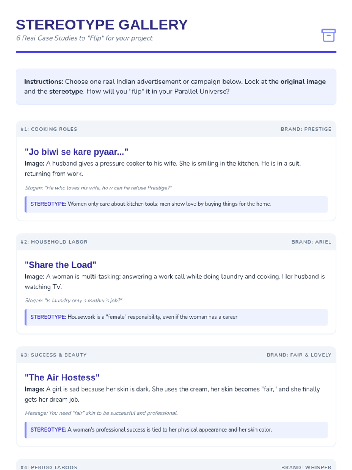 A student-facing handout describing six real Indian advertisements and social campaigns, including brands like Prestige, Ariel, and Fair & Lovely, with visual descriptions and stereotypes for project inspiration.
