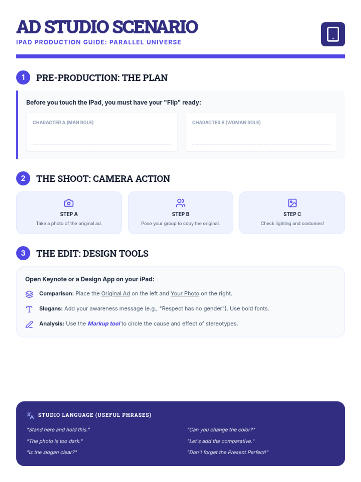 A student-facing production guide for creating their 'Parallel Universe' advertisement using an iPad, including planning, shooting, and editing steps with useful classroom language.