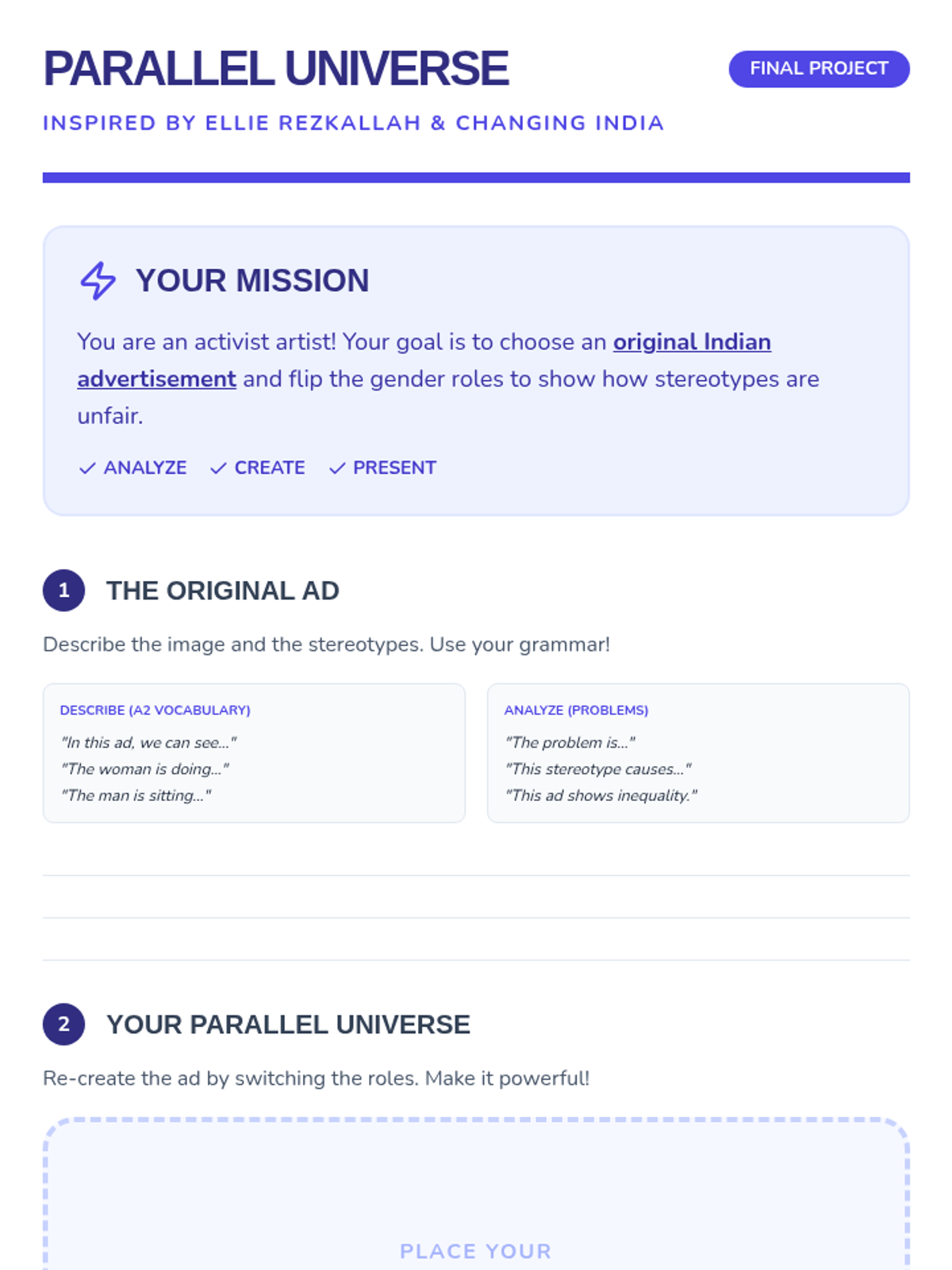 A project prompt sheet for A2 students to guide them in creating a 'Parallel Universe' advertisement, including sections for analysis, creation, and comparison.