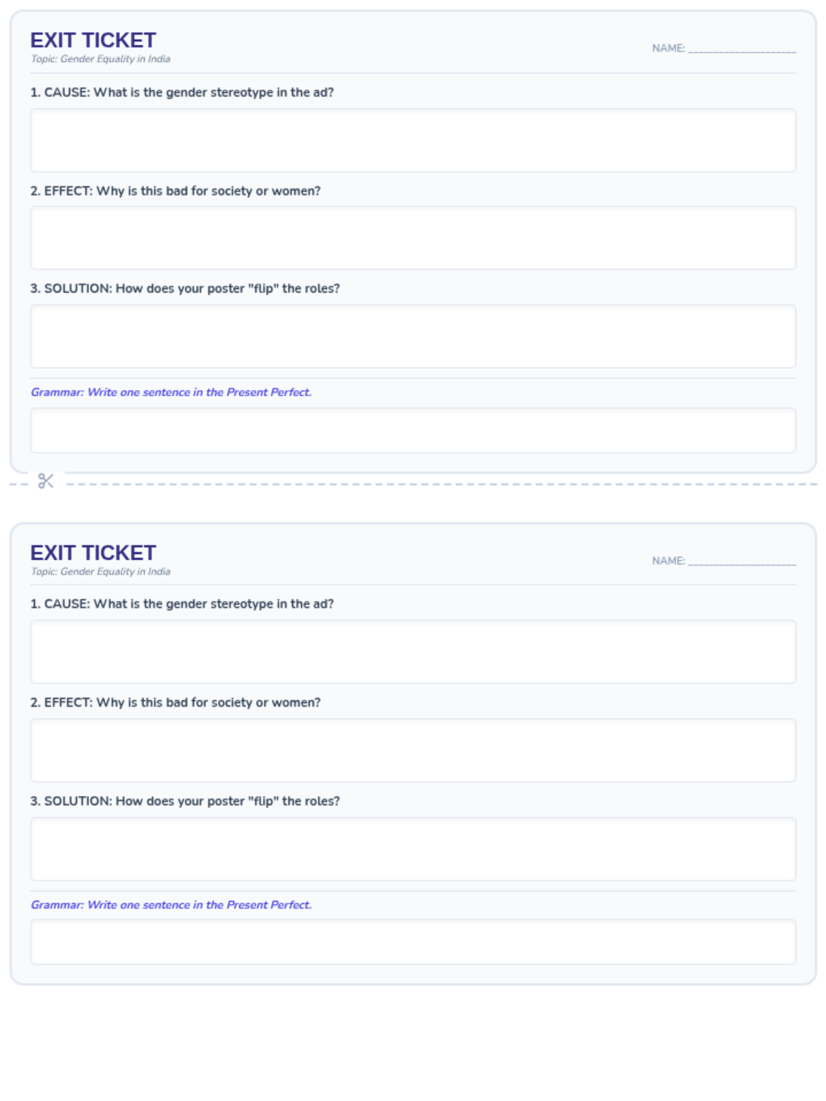 A double-slip exit ticket for students to briefly summarize the cause, effect, and solution of their chosen gender stereotype before beginning their final poster project.