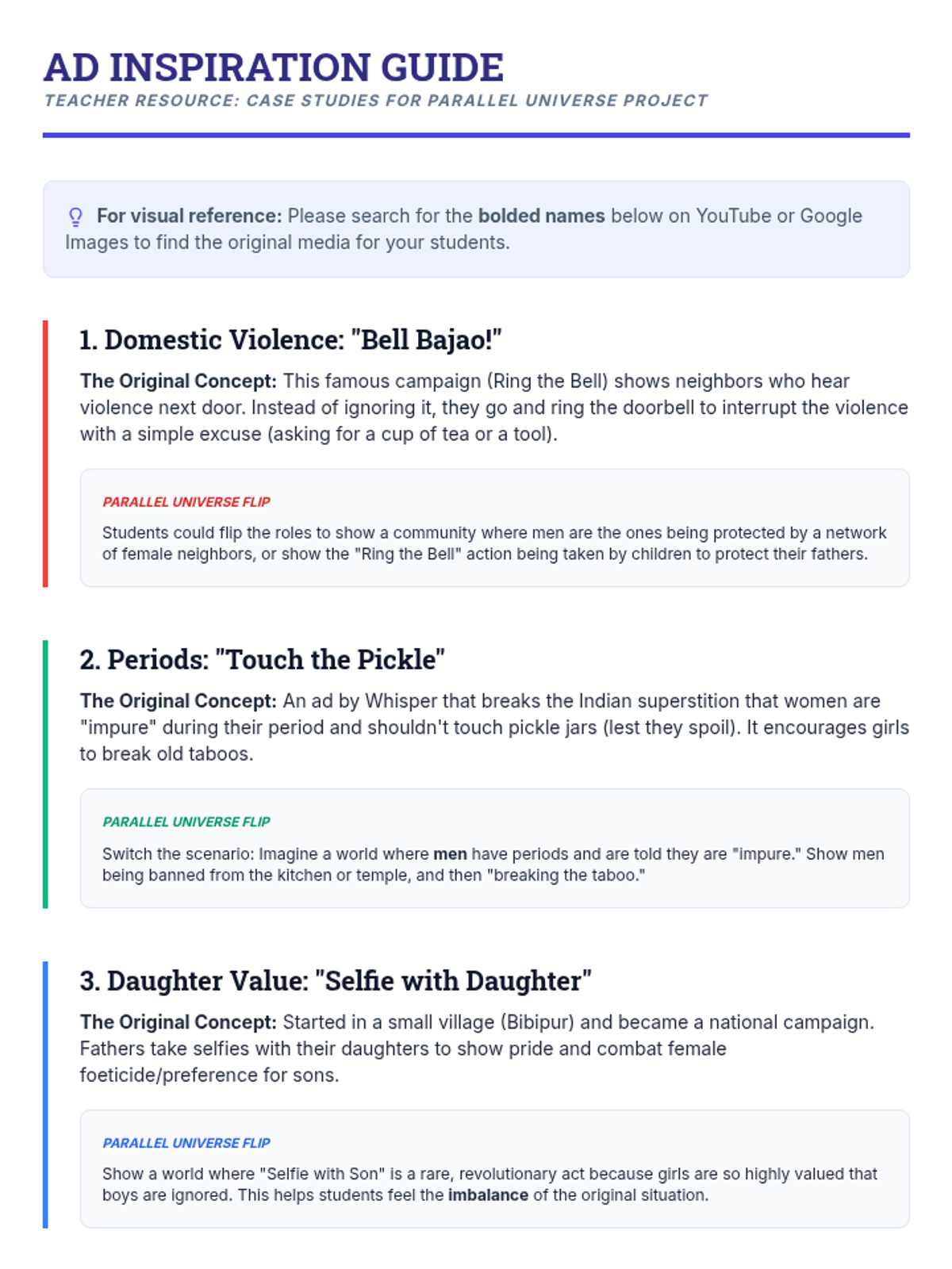 A teacher-facing reference guide describing famous Indian social campaigns (Bell Bajao, Touch the Pickle, etc.) with suggestions on how students can 'flip' them for their project.