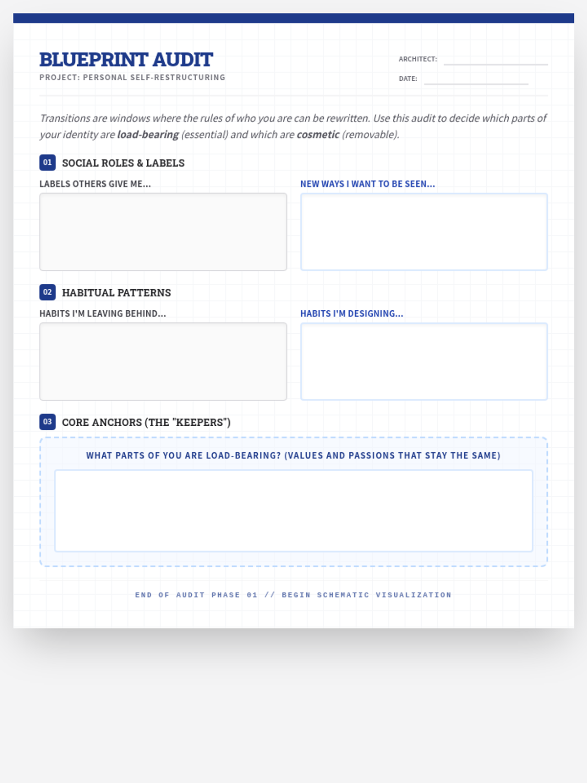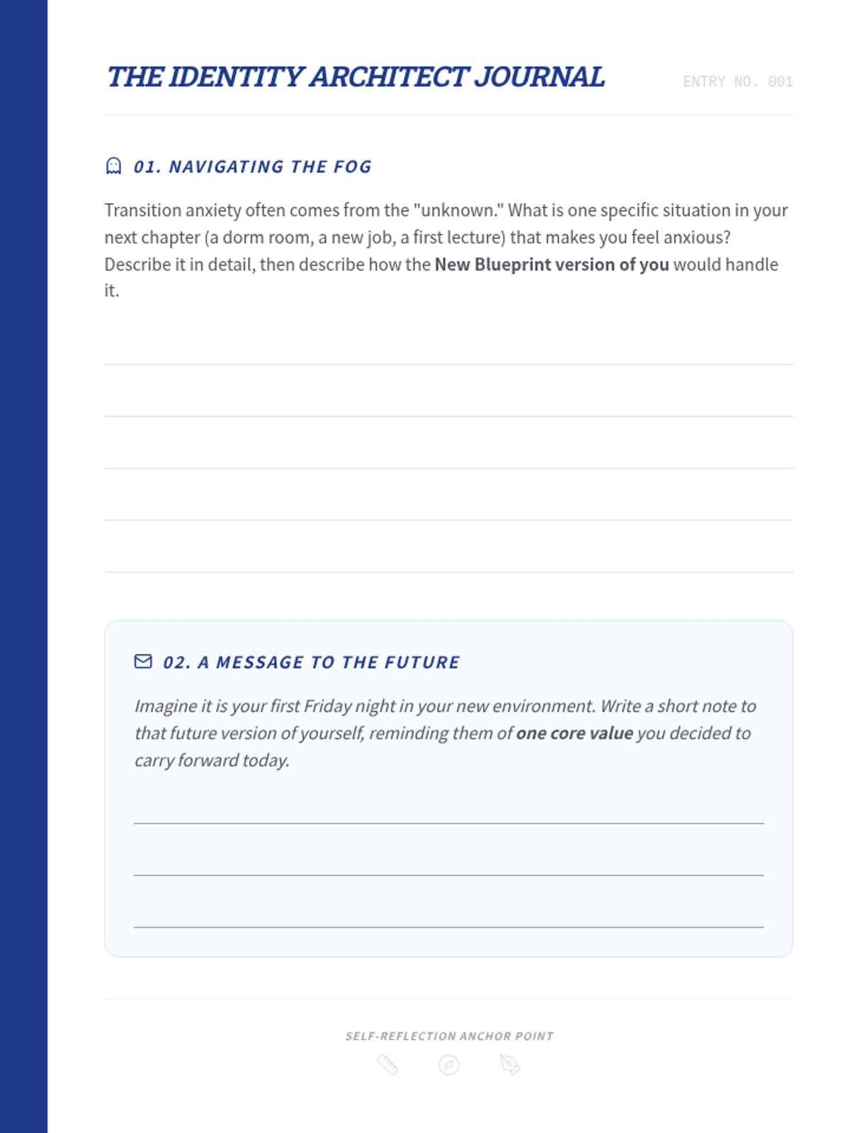 A guided journal for students to process their transition anxiety and document their personal growth intentions through the lens of architectural self-design.
