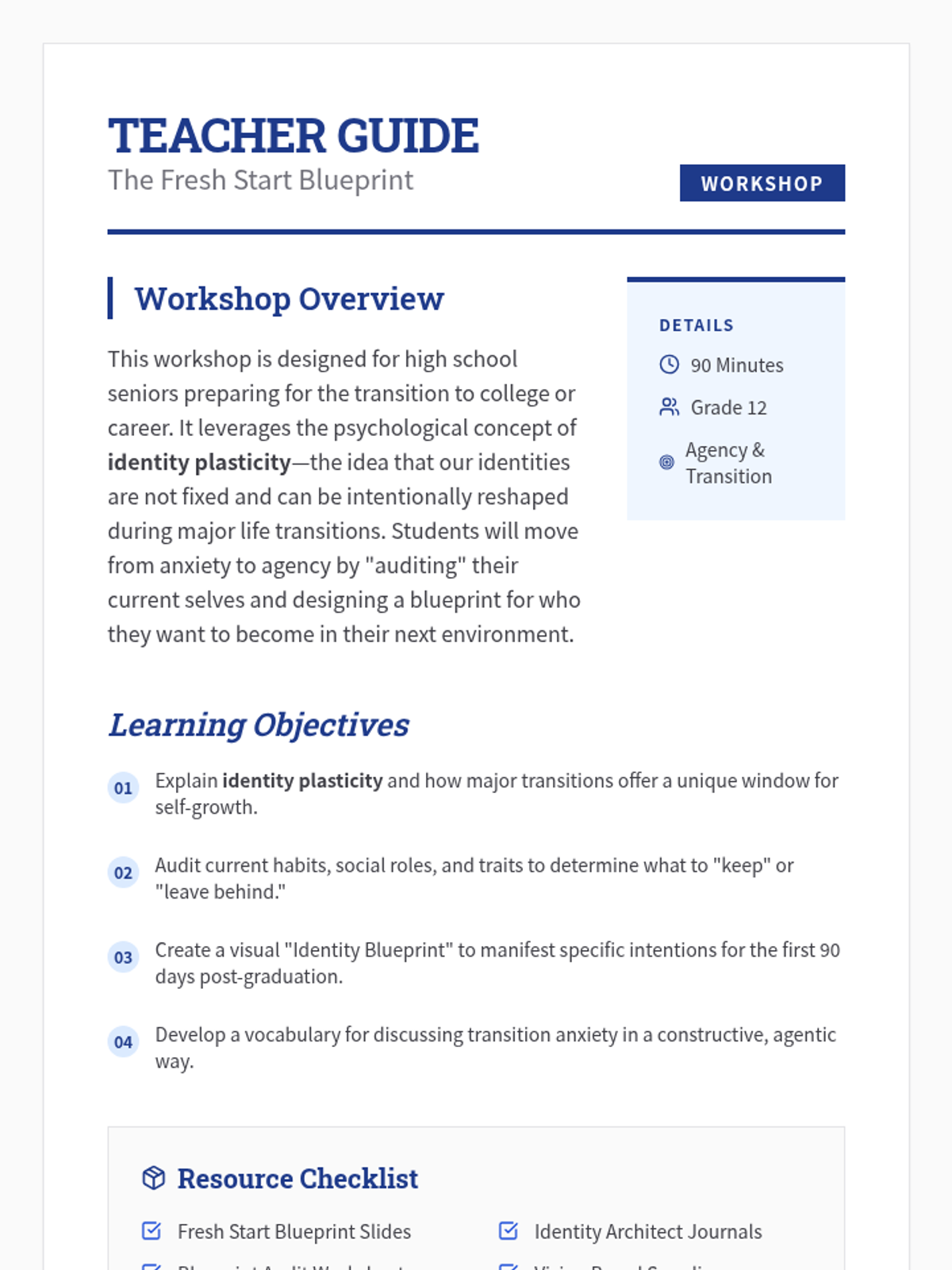 A comprehensive facilitator guide for the 'Fresh Start Blueprint' workshop, including timing, learning objectives, and pedagogical tips for teaching identity plasticity to graduating seniors.