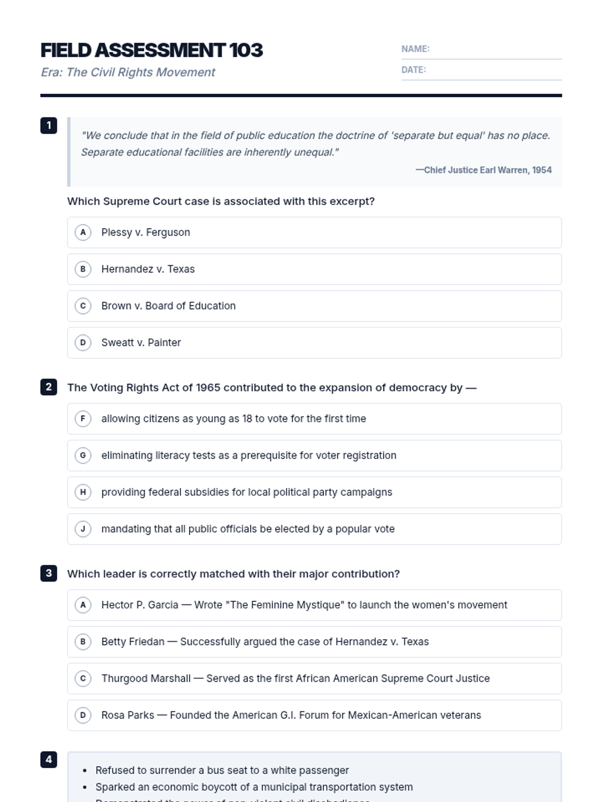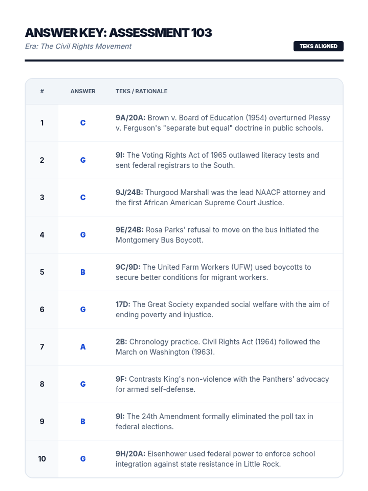 A 10-question unit assessment for the Civil Rights era, modeled after the 11th Grade Texas STAAR US History test. Includes stimulus-based questions, excerpts, and sequences covering landmark court cases (Brown v. Board), legislative acts (Voting Rights Act of 1965), diverse leadership (Marshall, Friedan, Chavez), and resistance strategies. Aligned with Texas TEKS 9, 17, and 20.