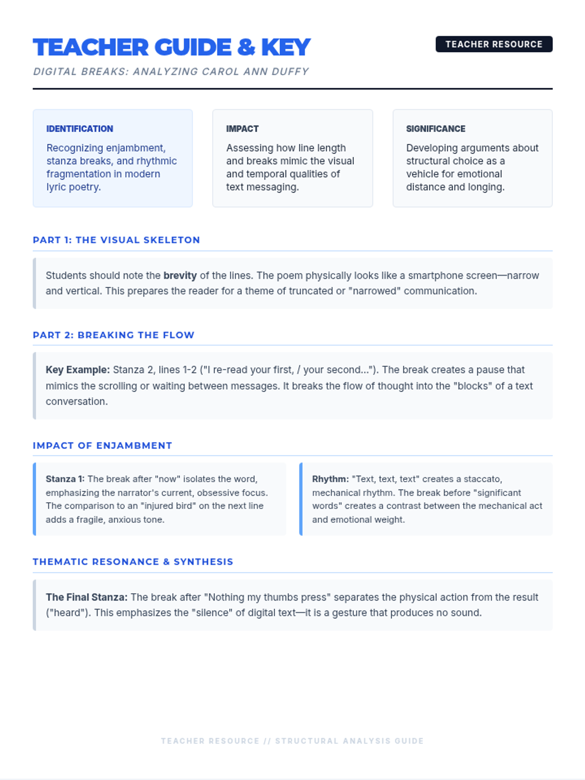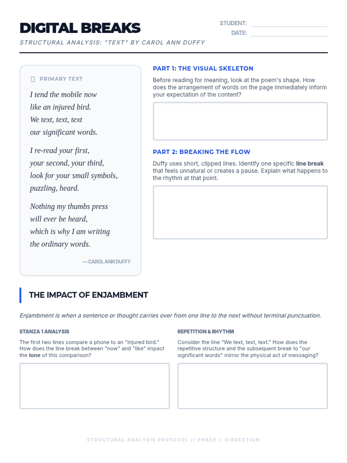 A two-page student worksheet exploring the structural elements of Carol Ann Duffy's poem 'Text'. It guides students from visual first impressions to deep analysis of line breaks and enjambment, culminating in a structured argument-writing task.