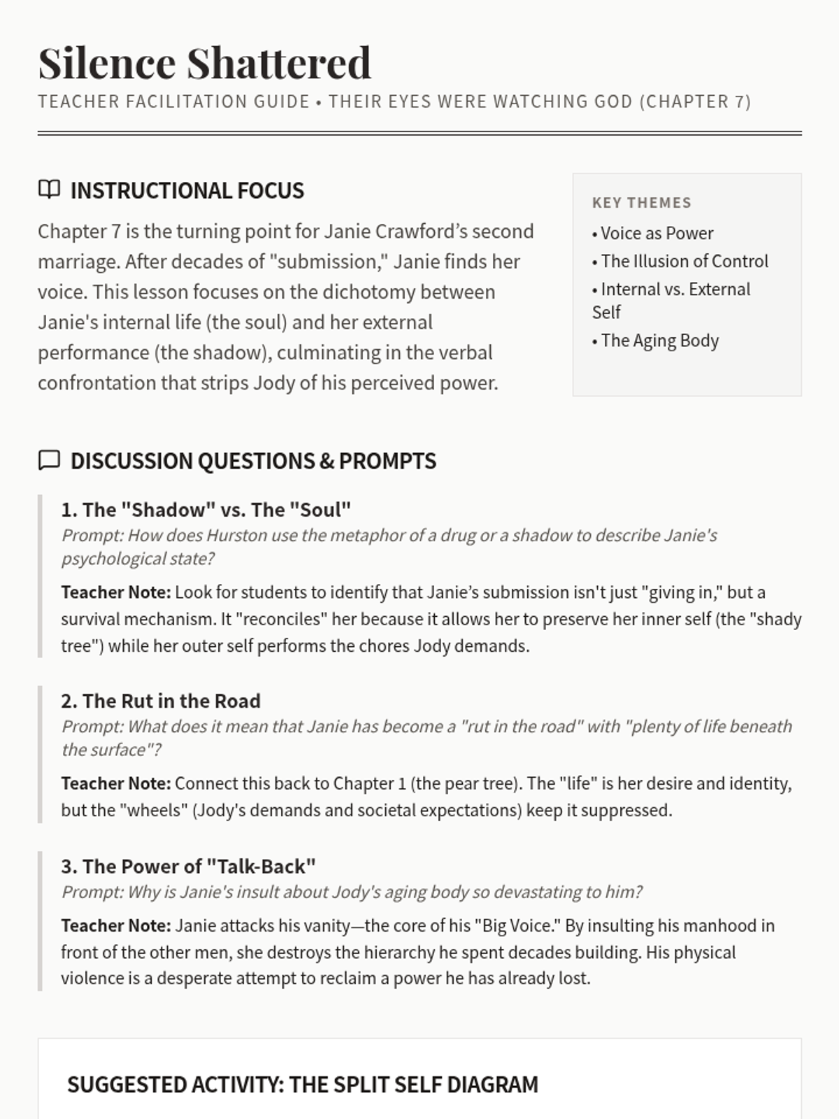 A facilitation guide for teachers covering Chapter 7 of Their Eyes Were Watching God, including discussion prompts, key themes, and activity suggestions focusing on Janie's internal conflict.