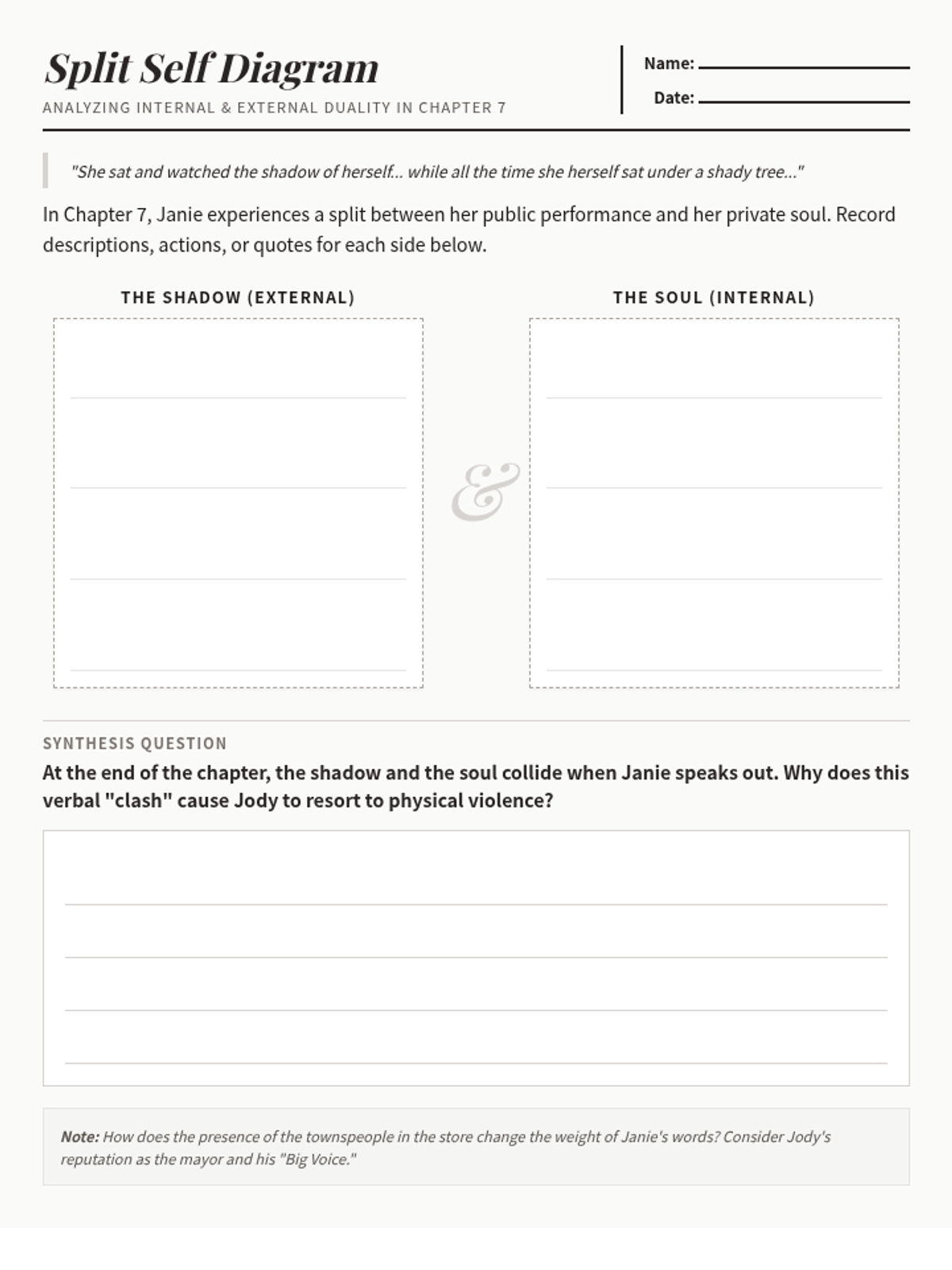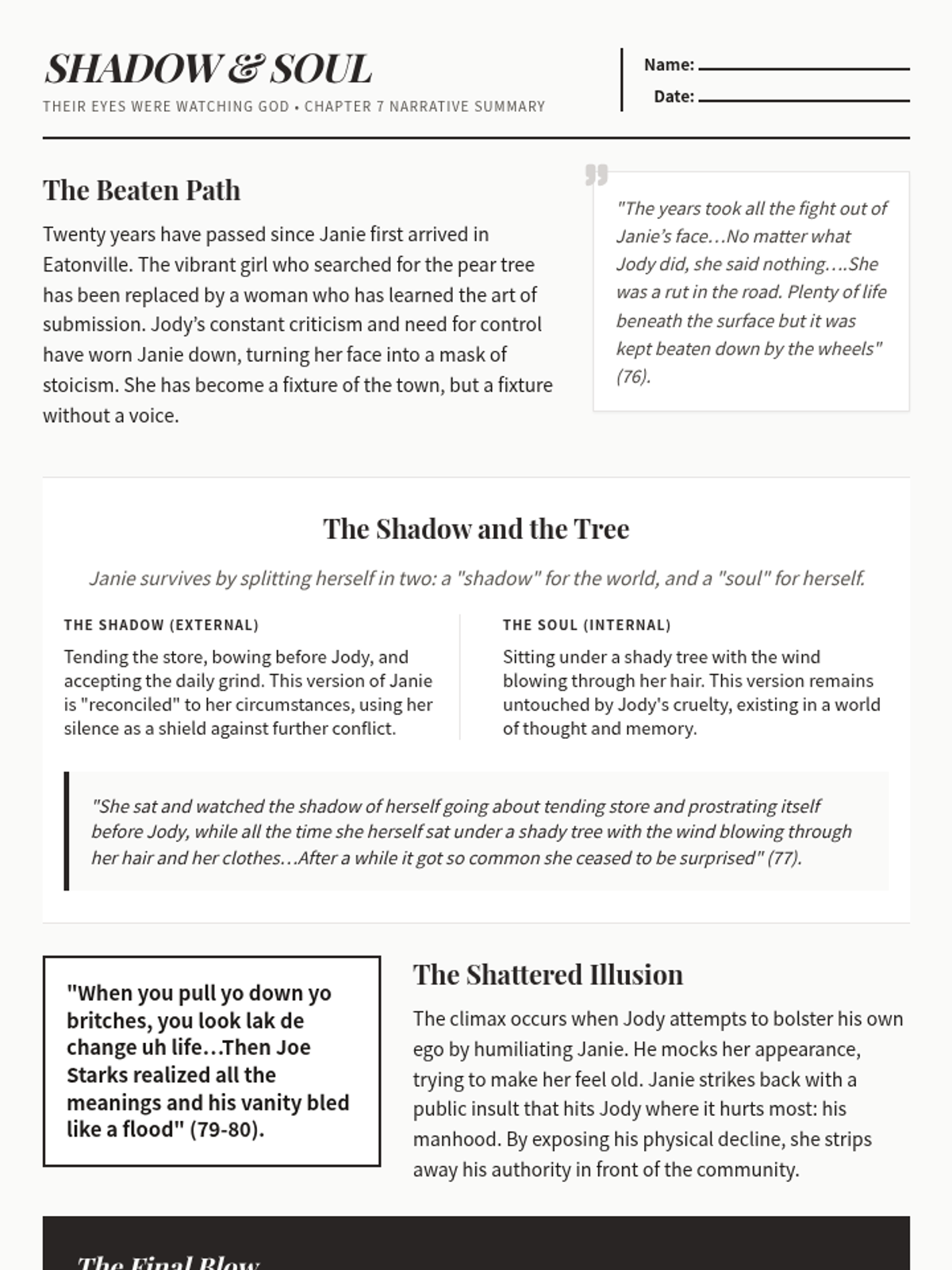 A narrative summary of Chapter 7 of Their Eyes Were Watching God, featuring key quotes, a breakdown of Janie's internal duality, and a reflection area for students.