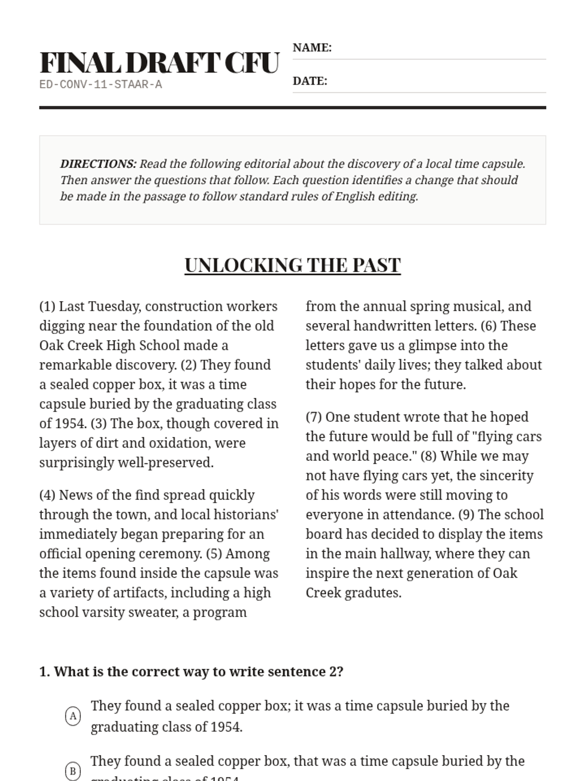 A STAAR-aligned editing assessment for 11th-grade students. It includes a short passage followed by four multiple-choice questions focusing on sentence boundaries, subject-verb agreement, punctuation, and spelling.