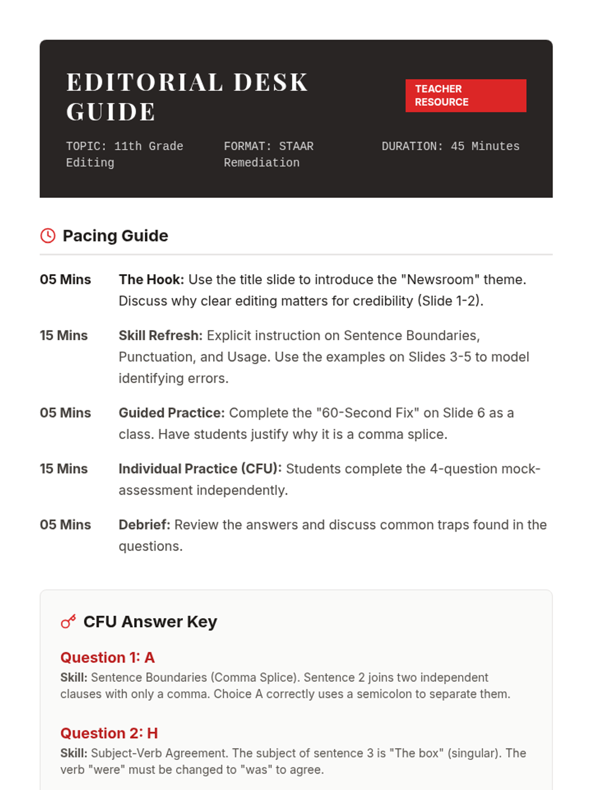 A teacher's resource guide for the editing remediation lesson. Includes a 45-minute pacing guide, an answer key with detailed rationales for the CFU questions, and a summary of common student misconceptions.