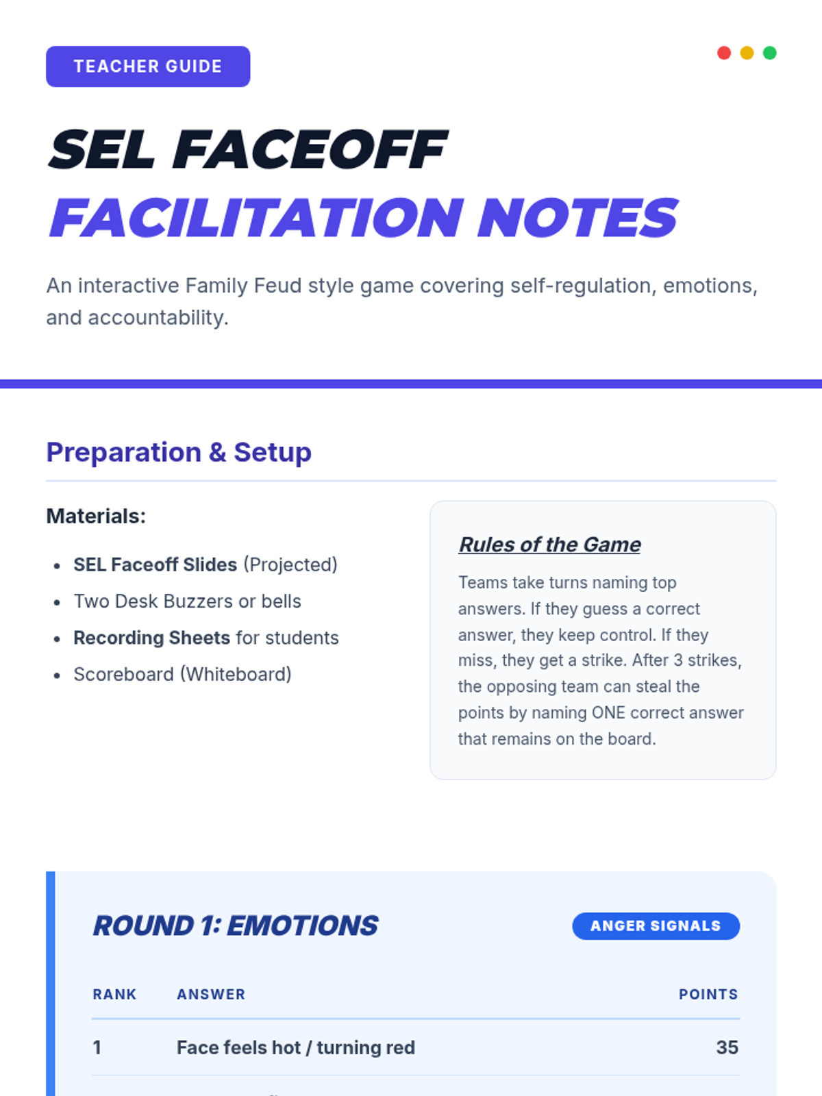 A teacher-facing facilitation guide and answer key for the 'SEL Faceoff' game. Includes board answers, point values, discussion prompts, and setup instructions.