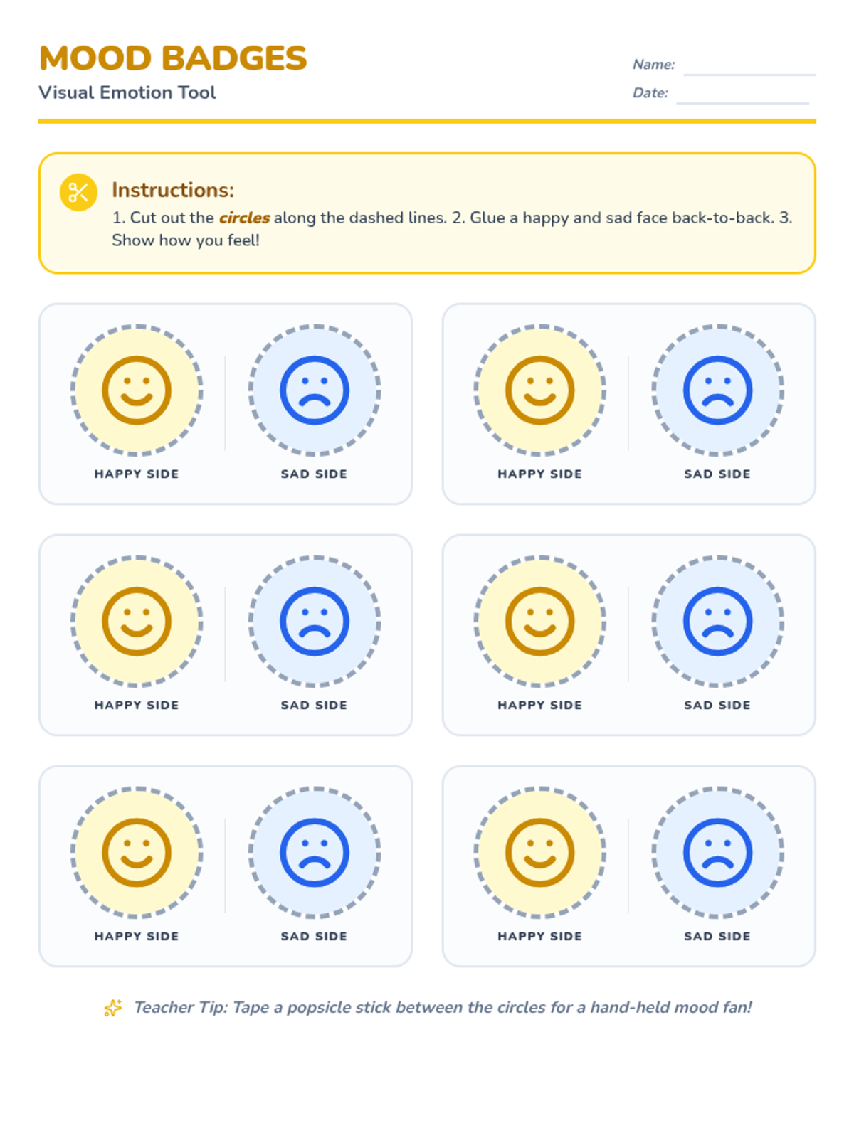 A worksheet featuring six sets of happy and sad face circles designed to be cut out and glued together to create double-sided mood communication tools for students.