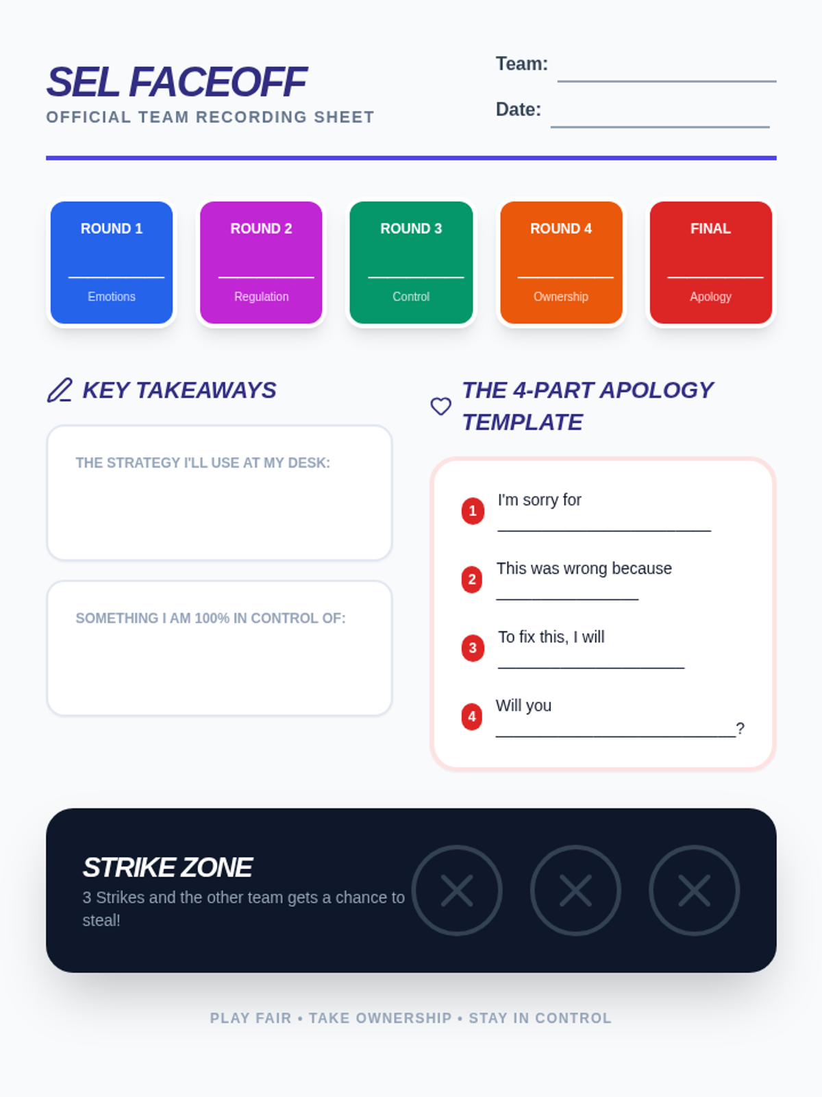 A student recording sheet for the 'SEL Faceoff' game. Includes a point tracker, strike zone, key takeaway fields, and a fill-in-the-blank template for the 4-part apology method.