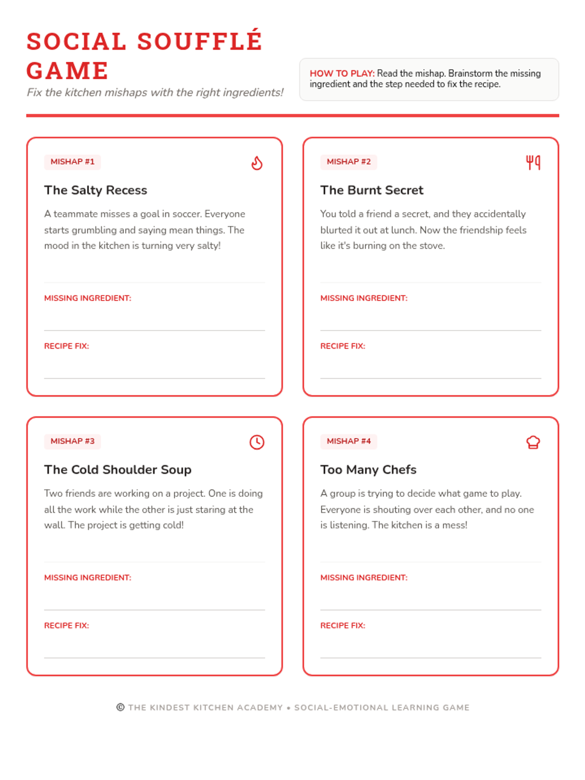 A set of printable task cards featuring social 'kitchen mishaps' (conflicts) that students must solve. Revised for better page breaks, consistent styling, and improved student work areas.