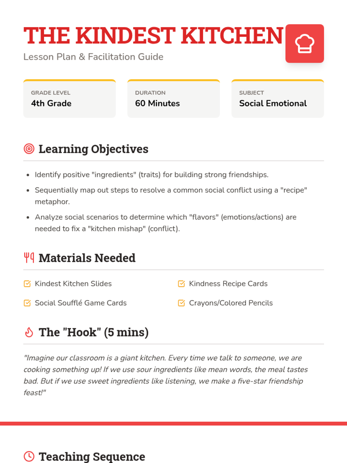 A detailed lesson plan for teachers, outlining the cooking metaphor for social interactions, including objectives, materials, and a step-by-step facilitation guide.