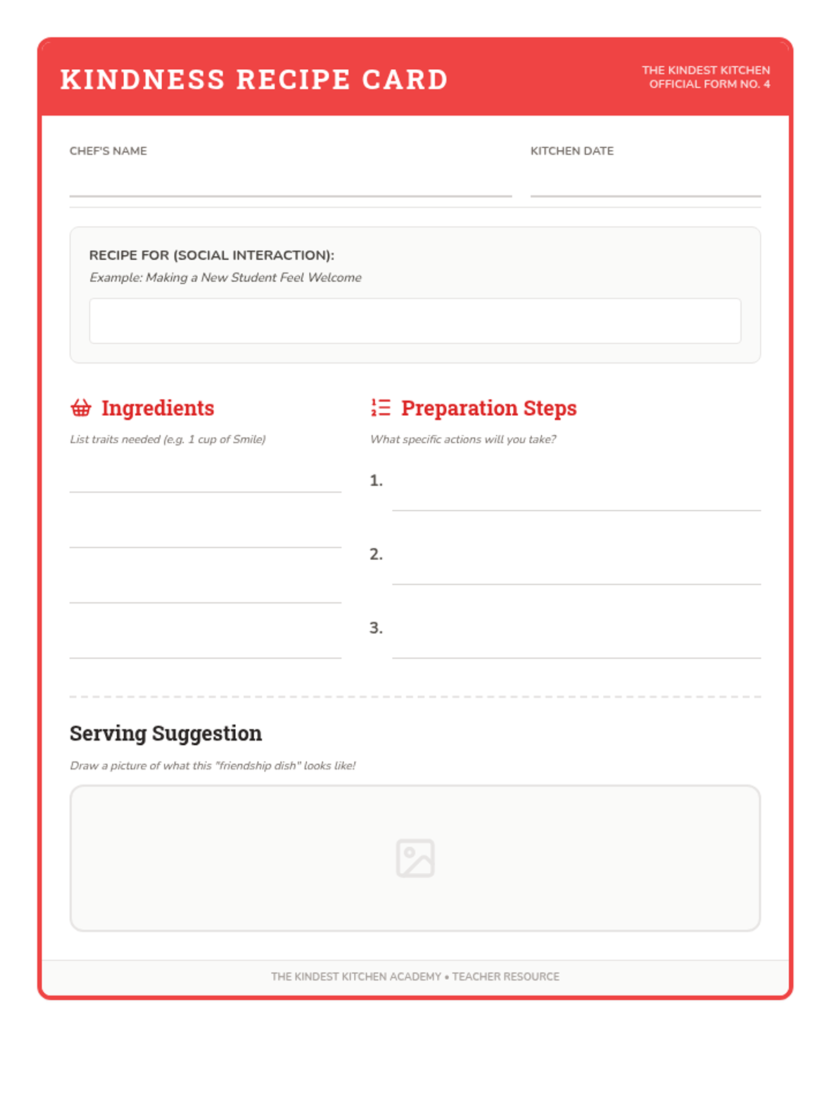 A creative worksheet designed like a recipe card where students define the ingredients (traits) and steps (actions) needed for positive social interactions. Revised for ink-saving and improved writing space.