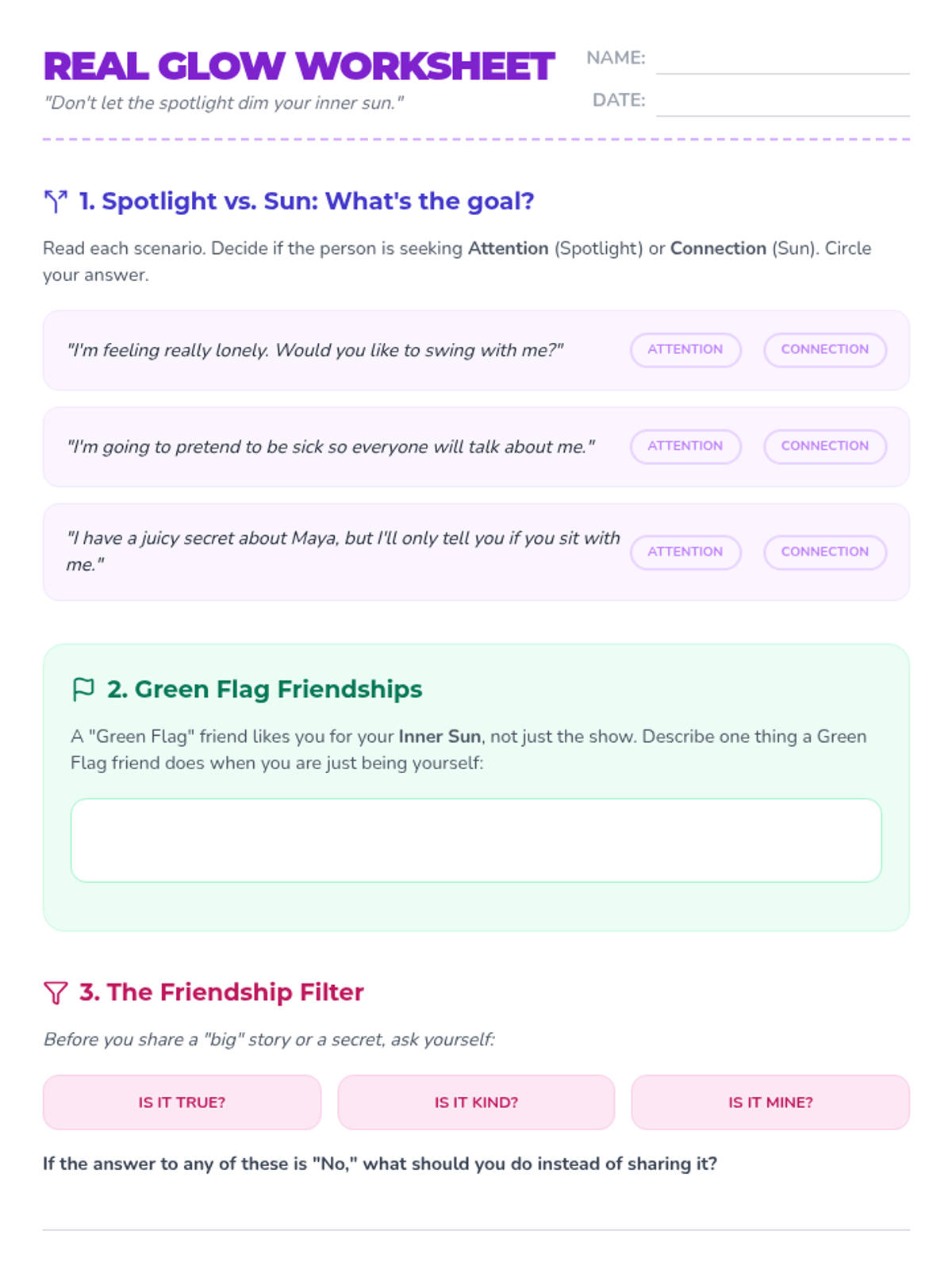 A reflection worksheet for 5th-grade girls focused on social integrity, truth-telling, and internal self-esteem. It includes scenario-sorting, a friendship green flag activity, and the 'friendship filter' exercise.
