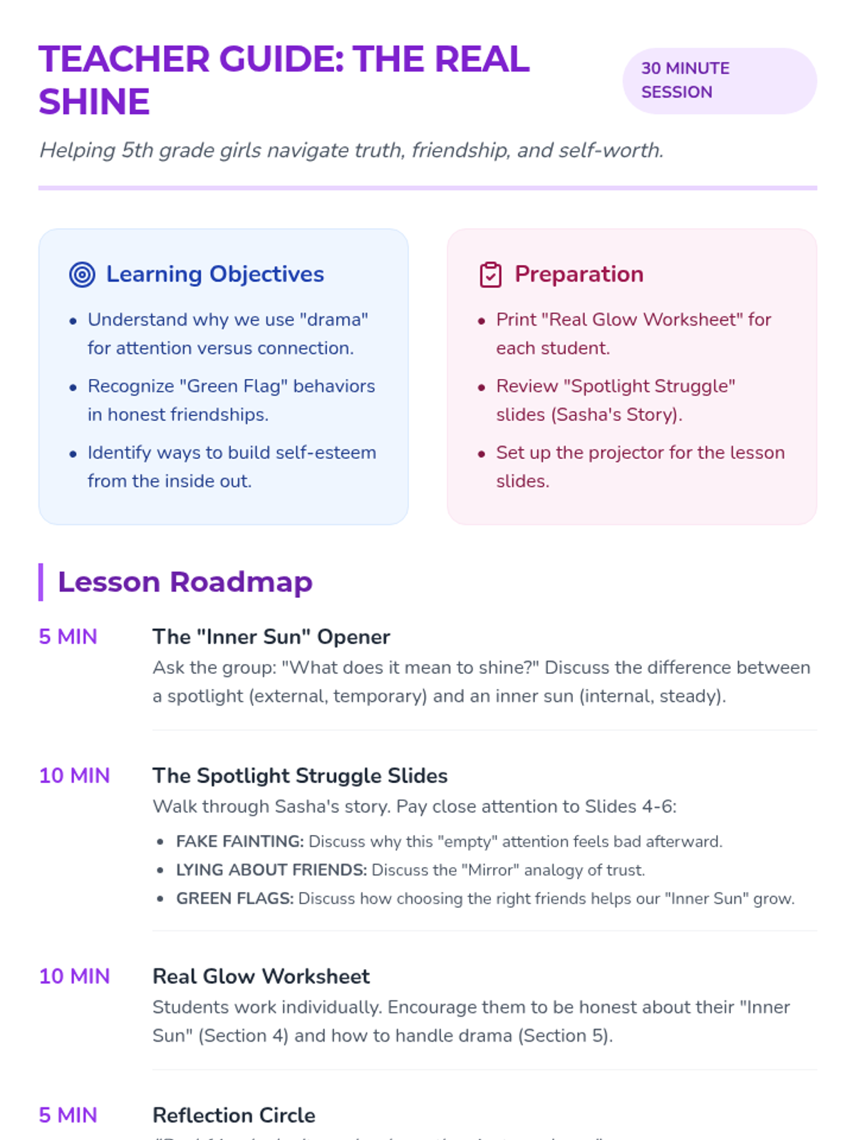 A comprehensive teacher guide for a 30-minute lesson on self-esteem and social integrity for 5th-grade girls, including learning objectives, a detailed timeline, and specific talking points for addressing attention-seeking behaviors.