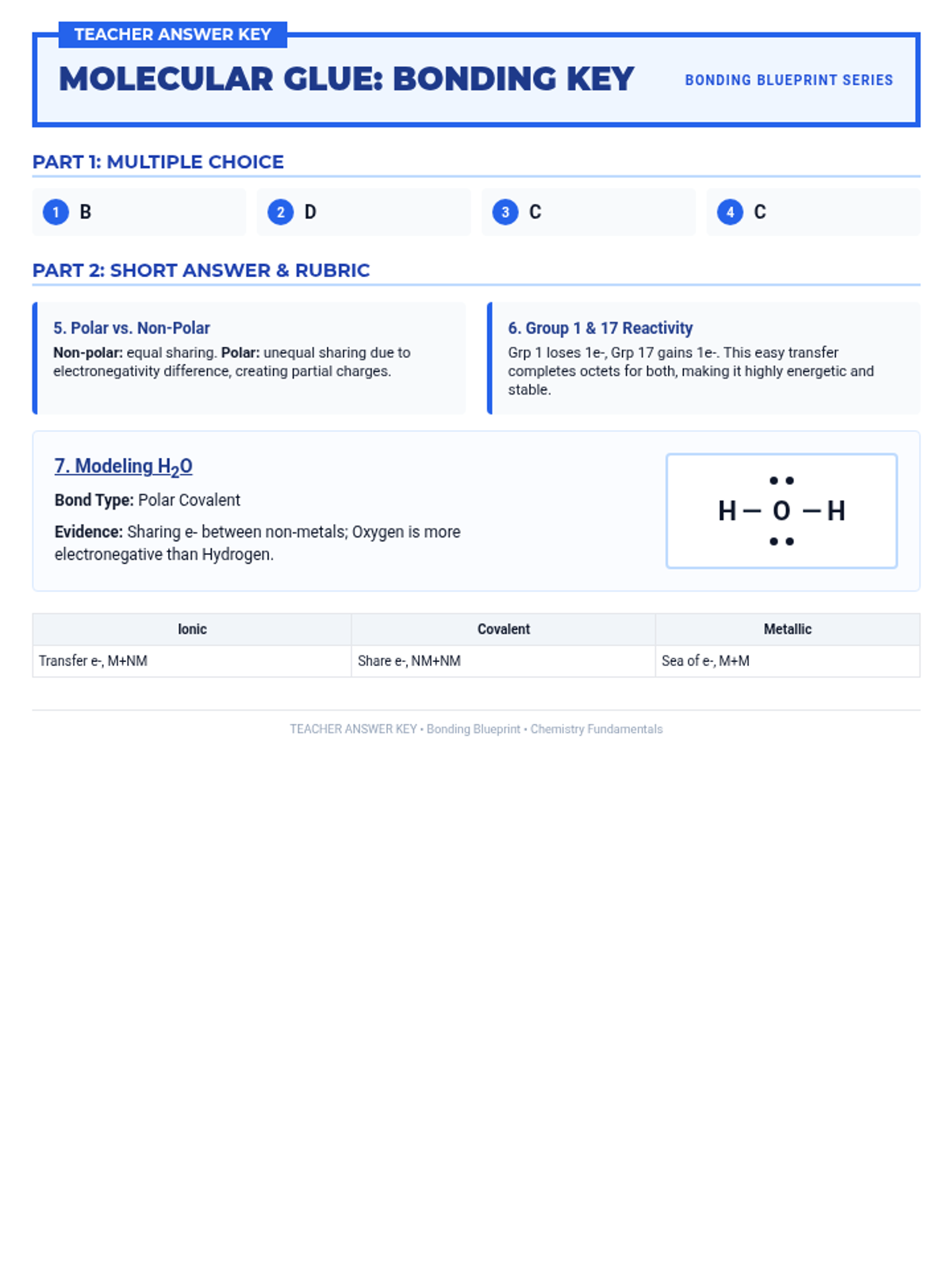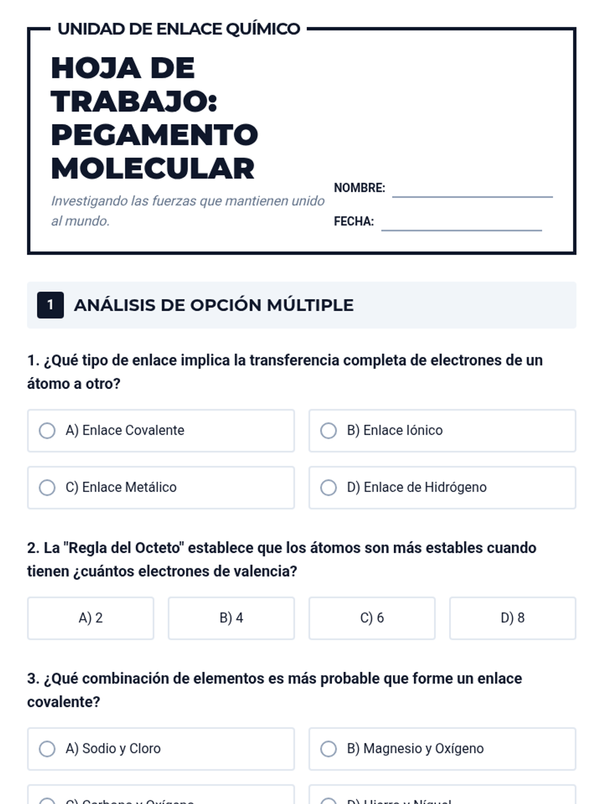 A practice worksheet for students covering chemical bonding, featuring multiple-choice questions and short-answer prompts to test understanding of ionic, covalent, and metallic bonds.