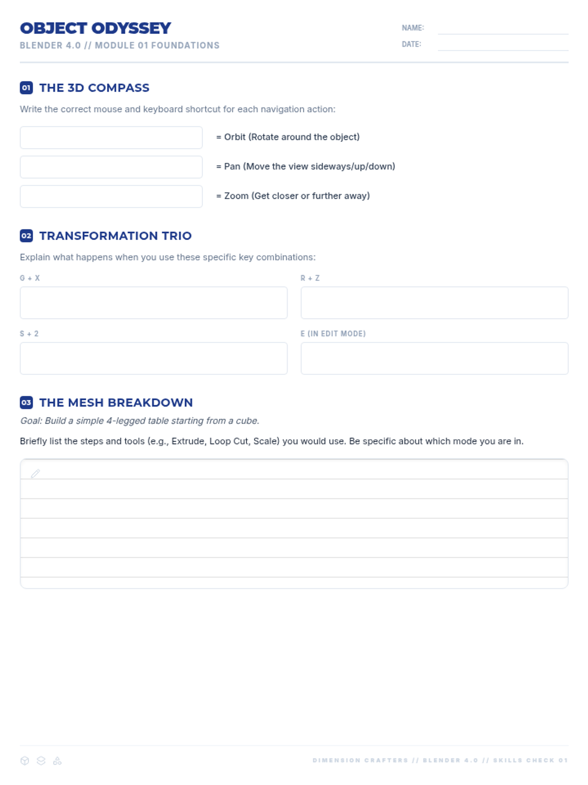 A student practice worksheet to assess understanding of Blender 4.0 navigation, transformation shortcuts, and conceptual modeling steps for a simple object.