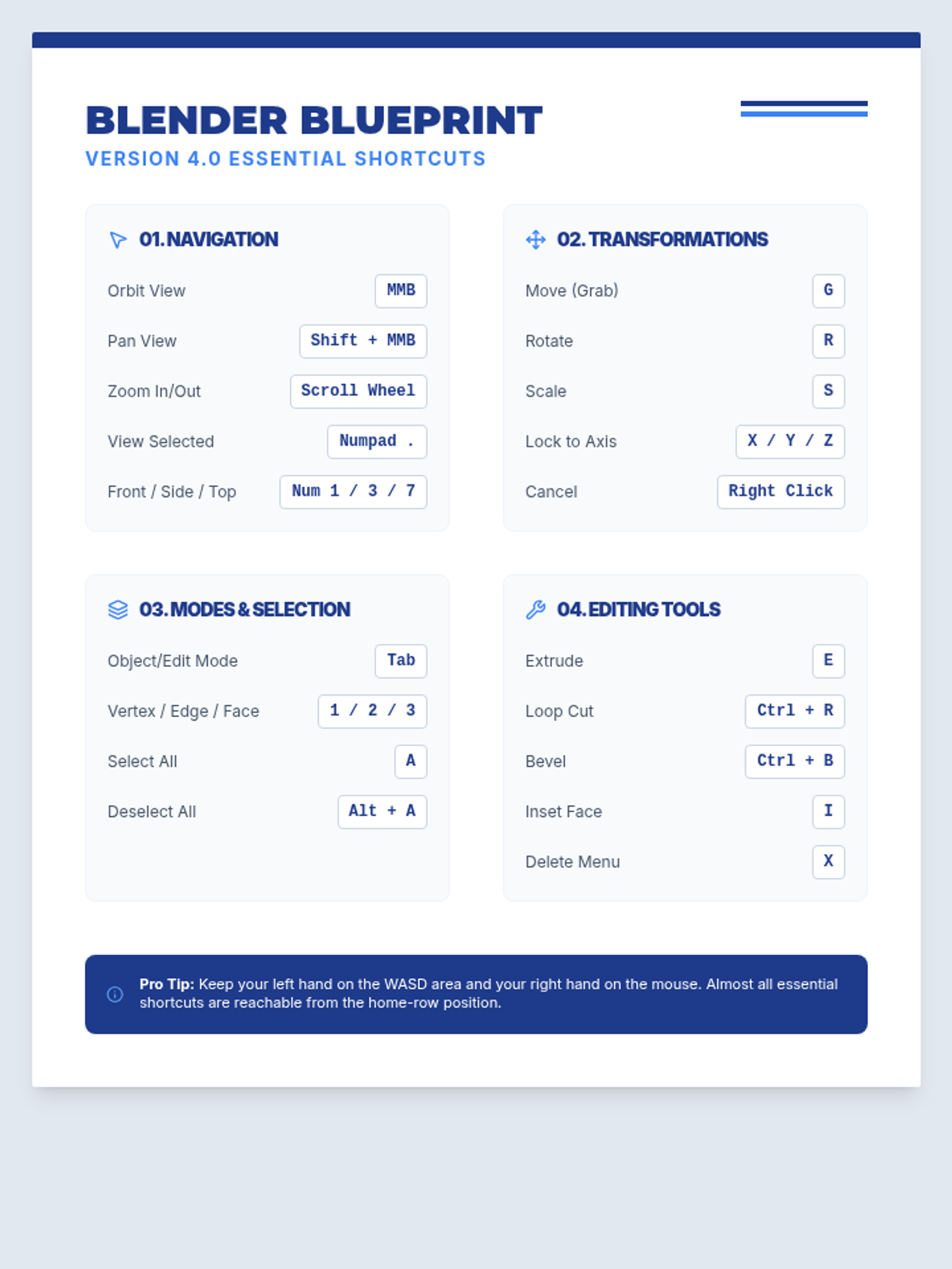A clean, blueprint-styled shortcut reference sheet for Blender 4.0, categorized by navigation, transformations, modes, and editing tools.