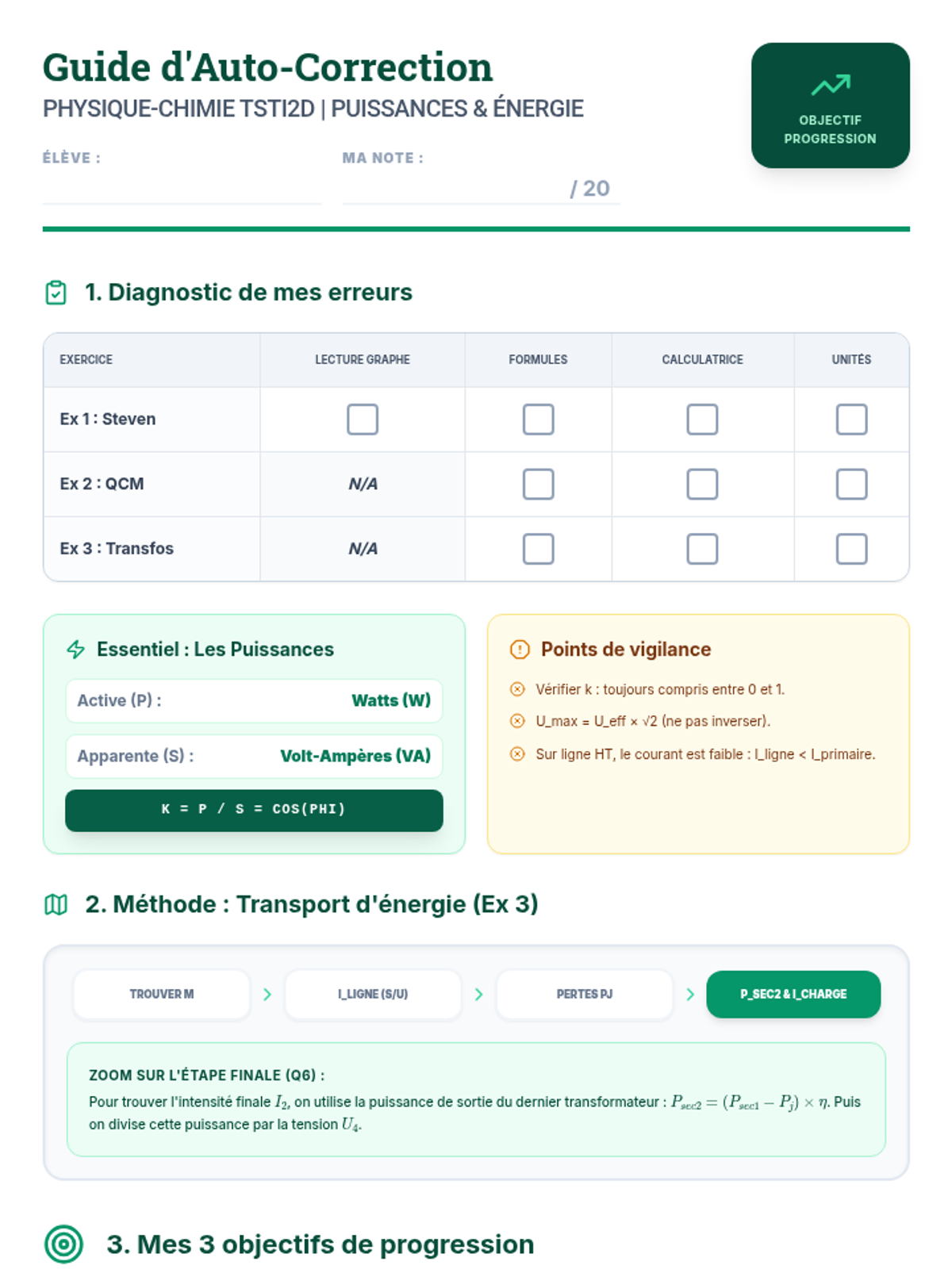 Student self-correction guide designed to help learners analyze their assessment errors. It includes error tracking tables, a formula cheat sheet for AC power and transformers, and pedagogical tips for solving electrical transport problems.
