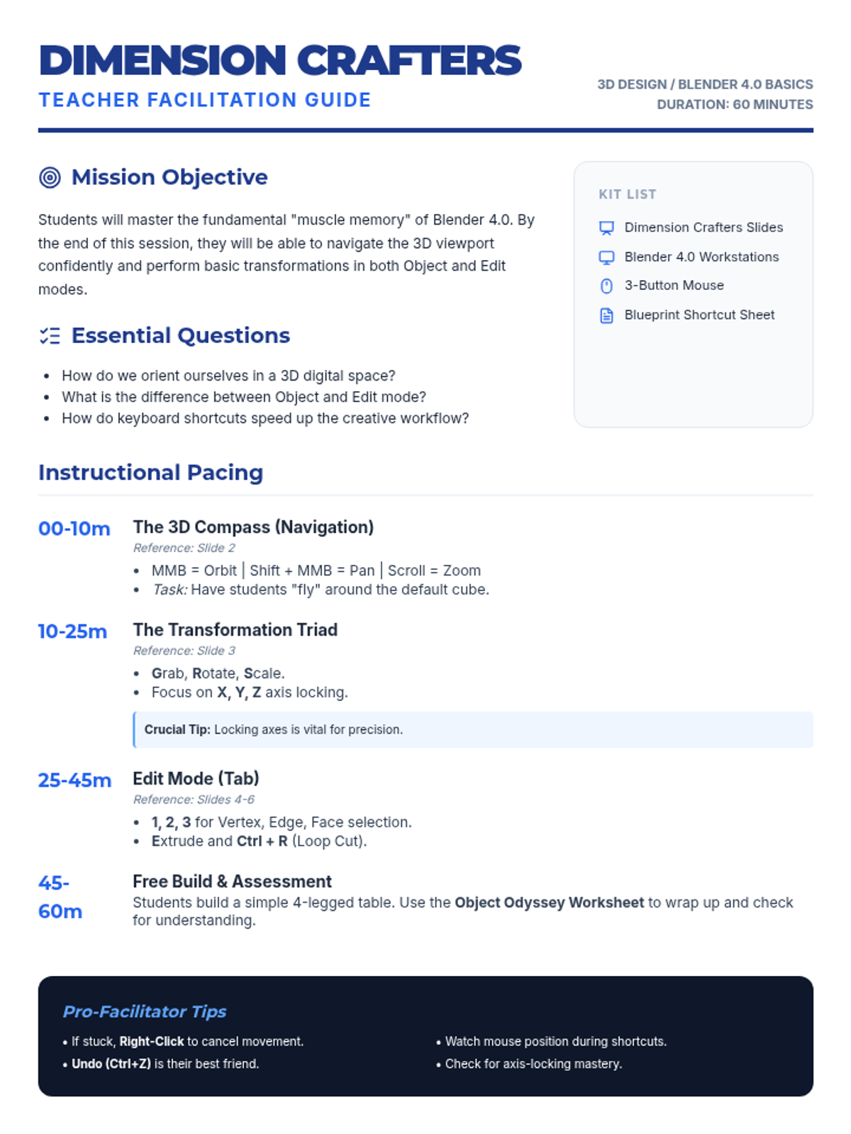 A comprehensive teacher's guide for the Dimension Crafters lesson, including learning objectives, a kit list, and a 60-minute instructional timeline for Blender 4.0 basics.