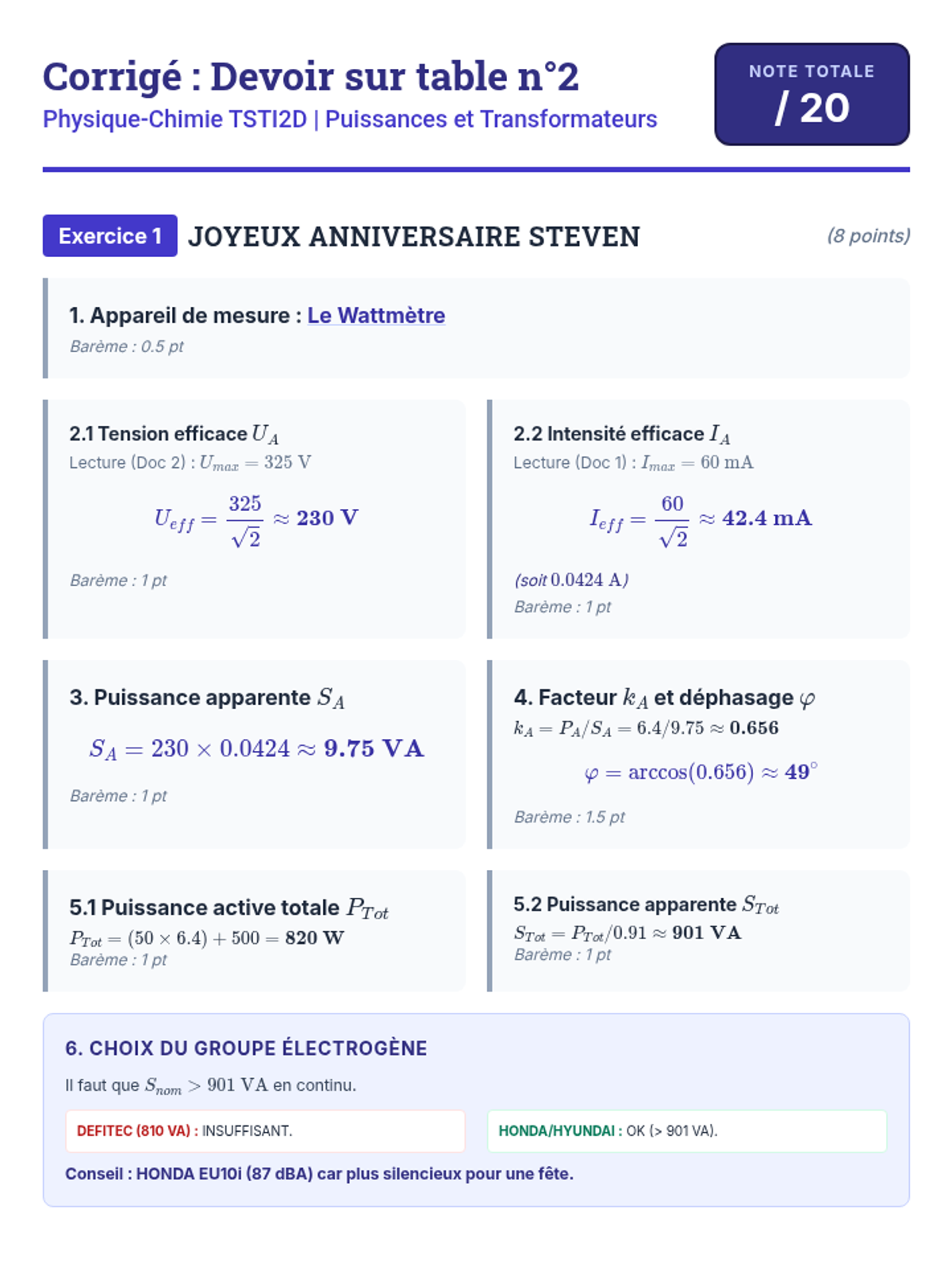 Detailed teacher answer key for the TSTI2D Physics assessment, including step-by-step calculations with MathJax, point breakdowns for each question, and a guide for selecting the correct electrical generator based on load calculations.