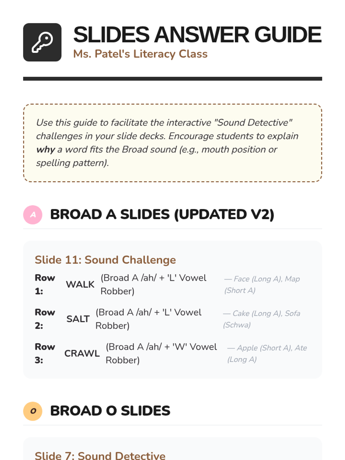 A comprehensive teacher's answer guide for the interactive "Sound Detective" challenges in the Broad A, Broad O, and Broad U slide decks. It explains why each word is correct and identifies the distractor sounds.