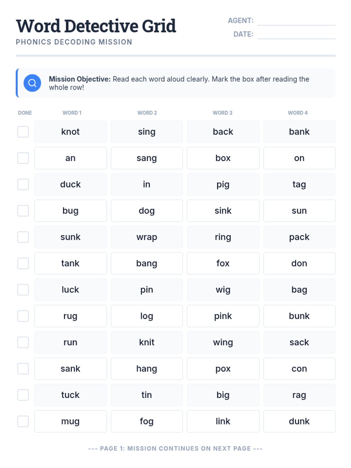 A phonics-based word list for student reading practice, presented in a clear 4-column grid. It covers 21 different word endings and specific 'kn' and 'wr' beginnings, themed as a 'Word Detective' mission. Now updated with scrambled word patterns and unified formatting for all words.