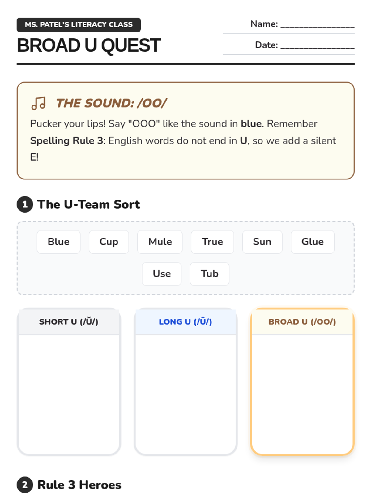 A practice worksheet for Broad U sounds (/oo/), featuring word sorting (Short, Long, Broad), word completion with silent 'e', and a drawing area. Revised to correct phonics examples and improve page layout.
