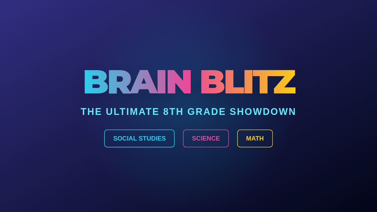 A vibrant, arcade-themed jeopardy-style slide deck featuring 25 questions across Social Studies, Math, and Science. Each question slide is followed by a high-impact answer reveal.