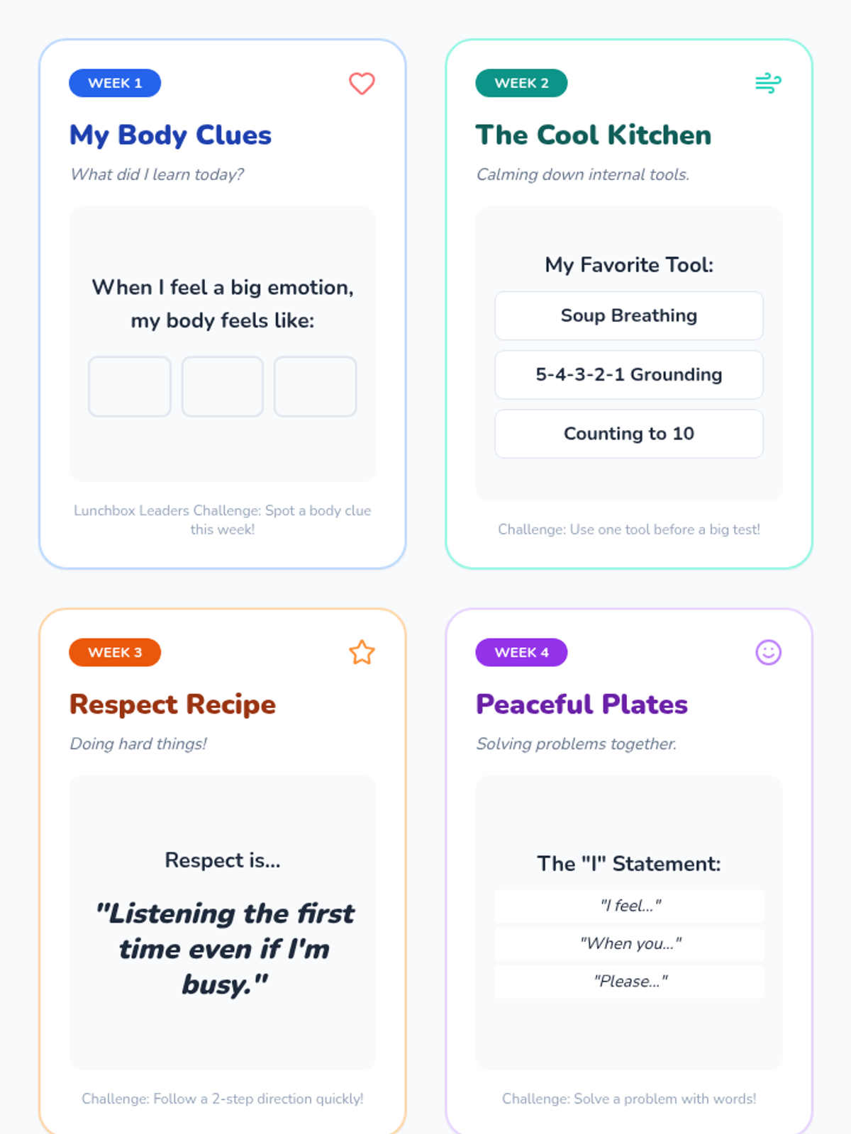 A set of weekly take-home cards for students in the Lunchbox Leaders program, providing reminders of key skills and weekly challenges.