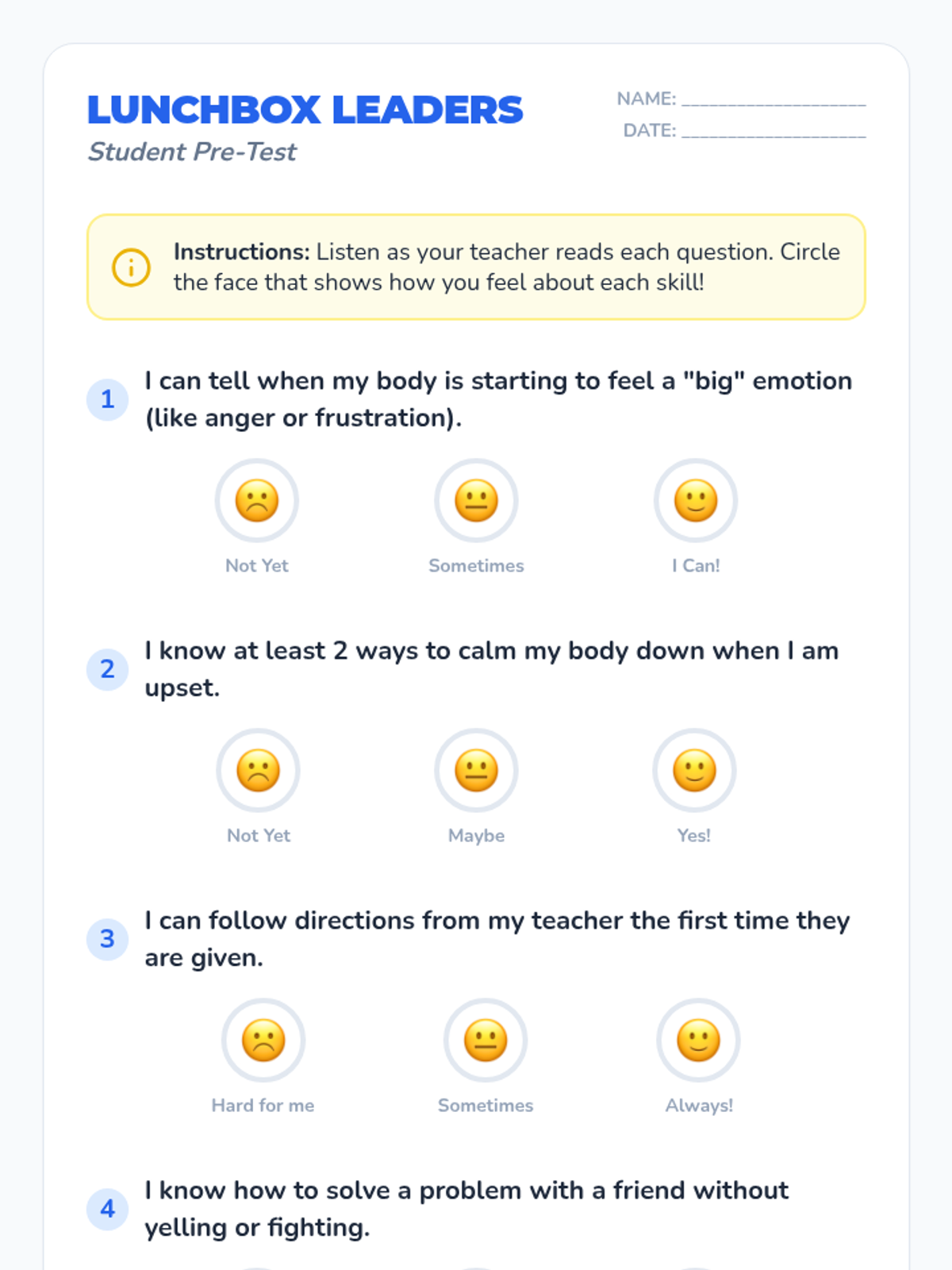 A visual pre- and post-test assessment for K-3 students to self-evaluate their skills in emotional regulation, respect, conflict resolution, and organization.